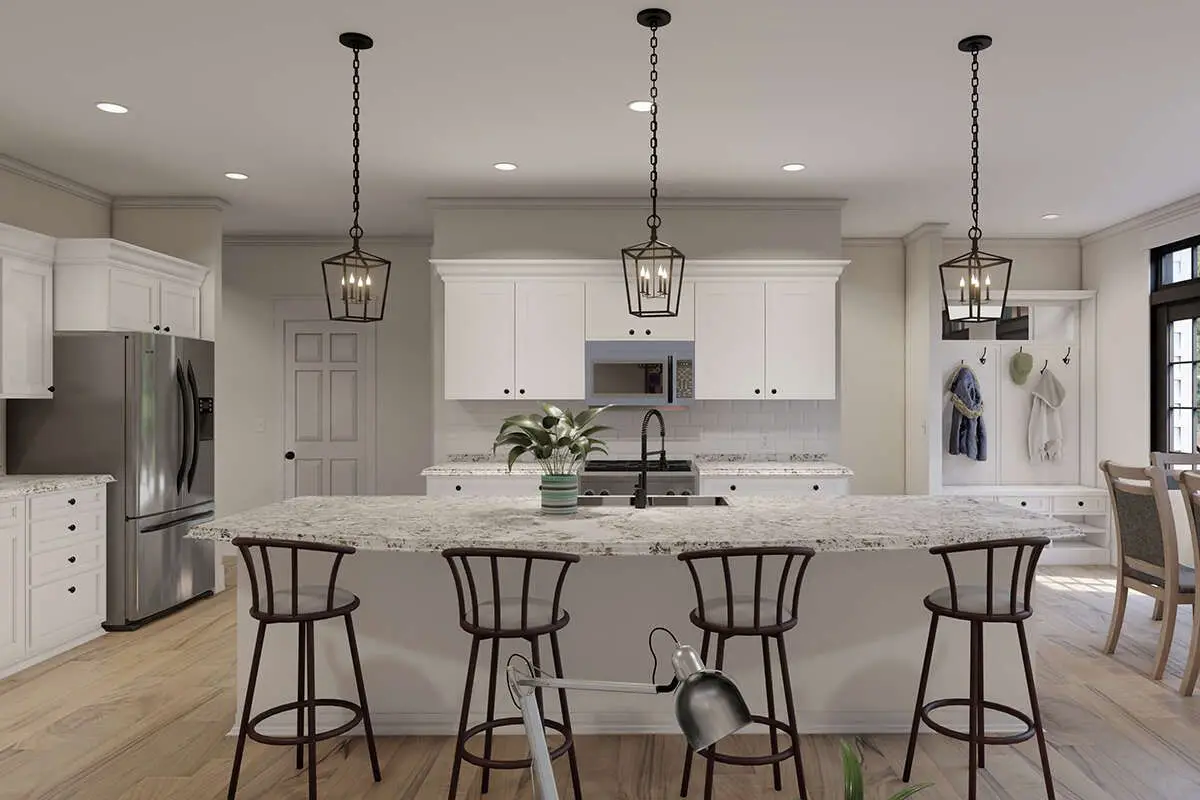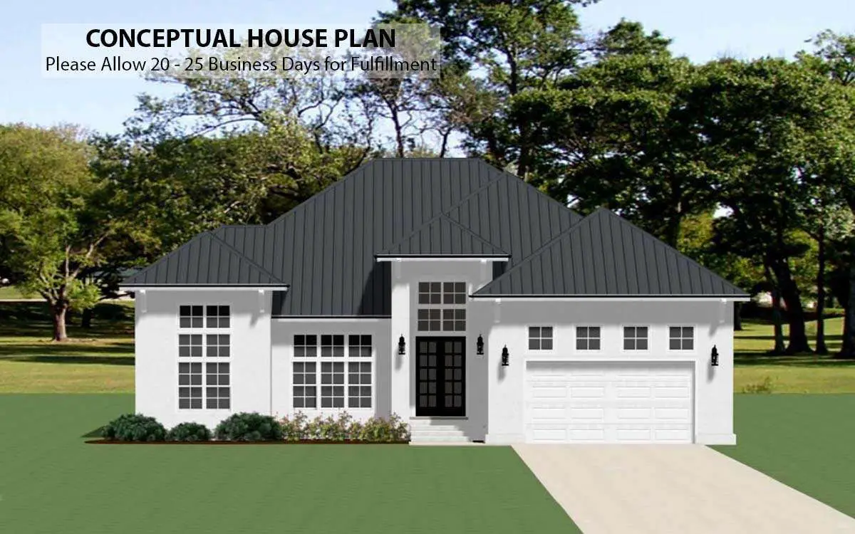 This sleek, modern plan gives you about 2,330 sq ft of living space with 3 bedrooms, 2 full bathrooms, 1 half bath, and a 2-car garage.