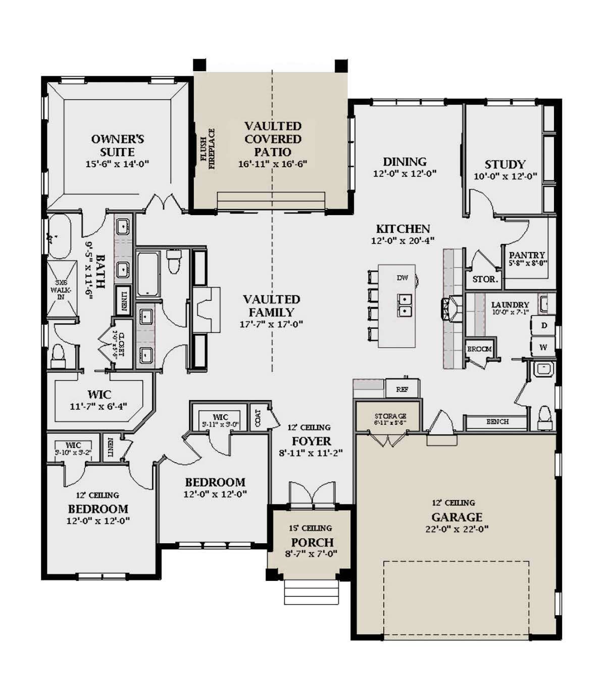 - Great Room: Central, open, with vaulted ceiling and expansive connection to other spaces.