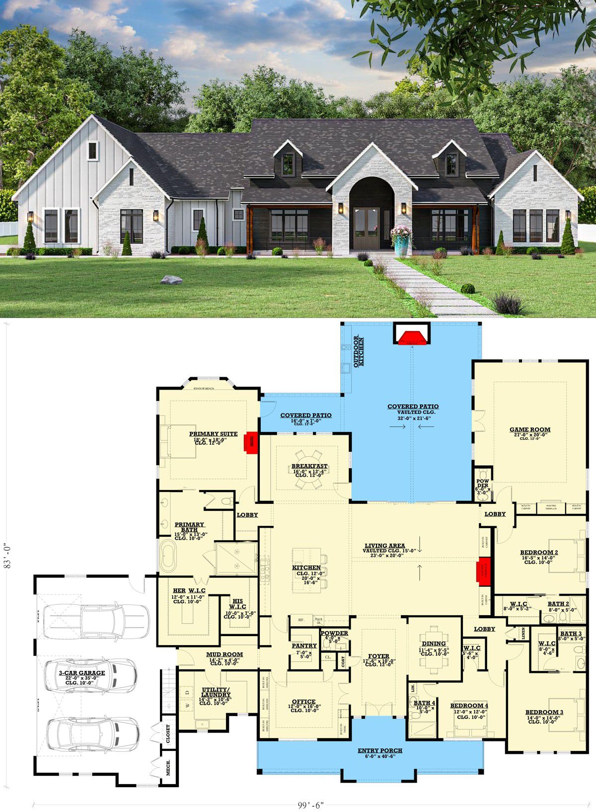 This is a spacious, stylish one-story transitional farmhouse plan measuring approximately 4,187 sq ft. It offers **4 bedrooms**, **4 full bathrooms**, **2 half baths**, a side-entry 3-car garage, and plenty of room for lounging, entertaining, and living large.0