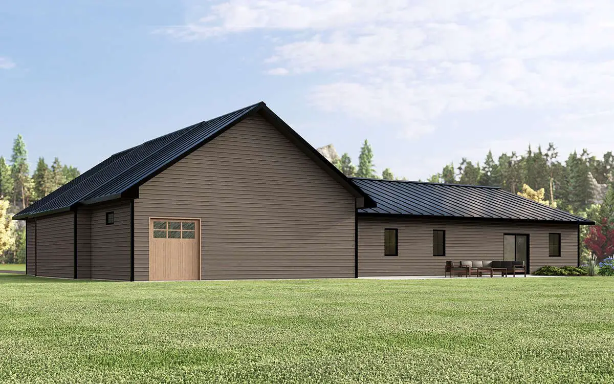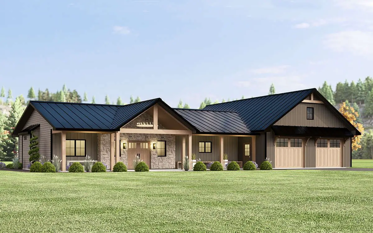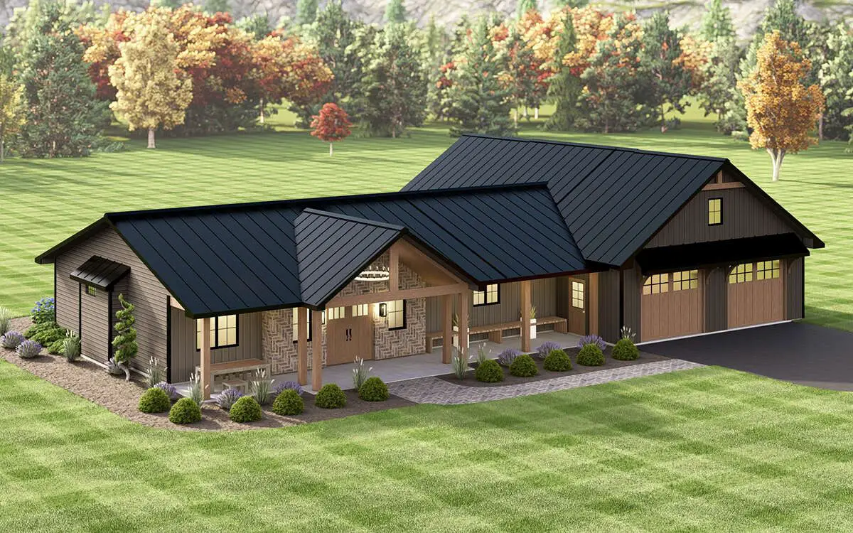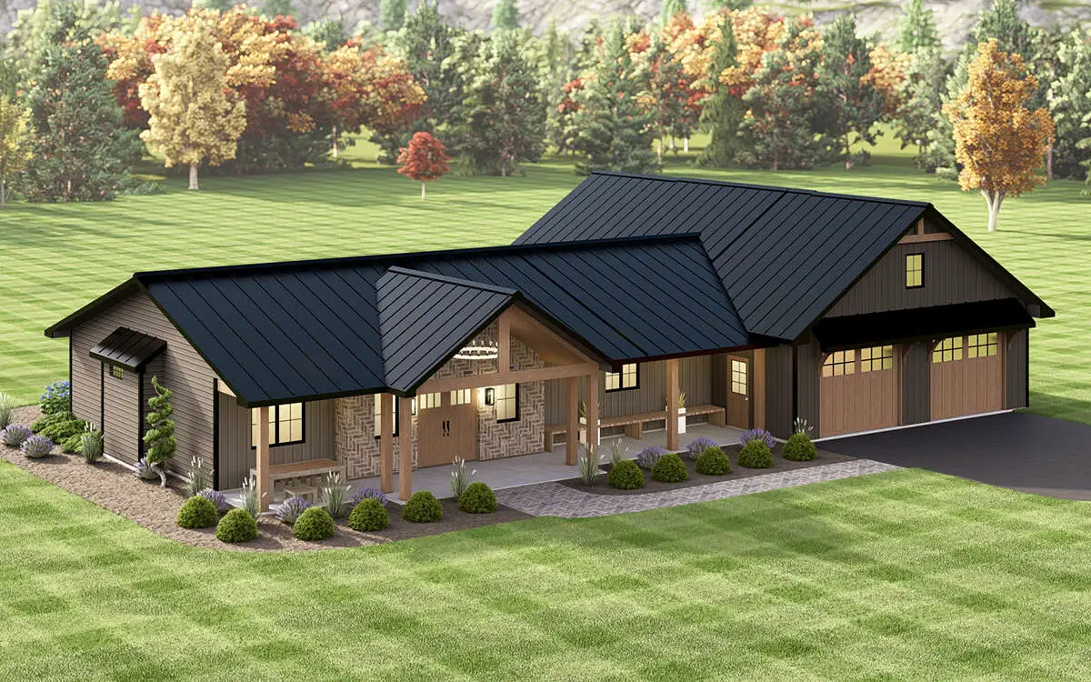 A steep roofline, wide gables, and board-and-batten siding lend the barn feel, while modest porches front and rear invite you to linger outdoors. It’s a look that blends rural sensibility with modern clarity.