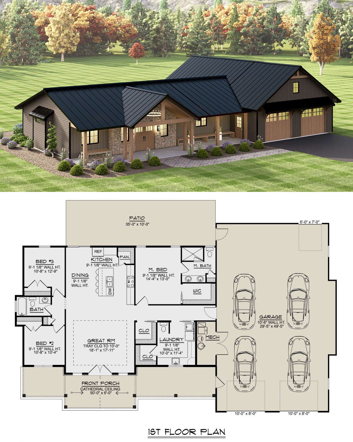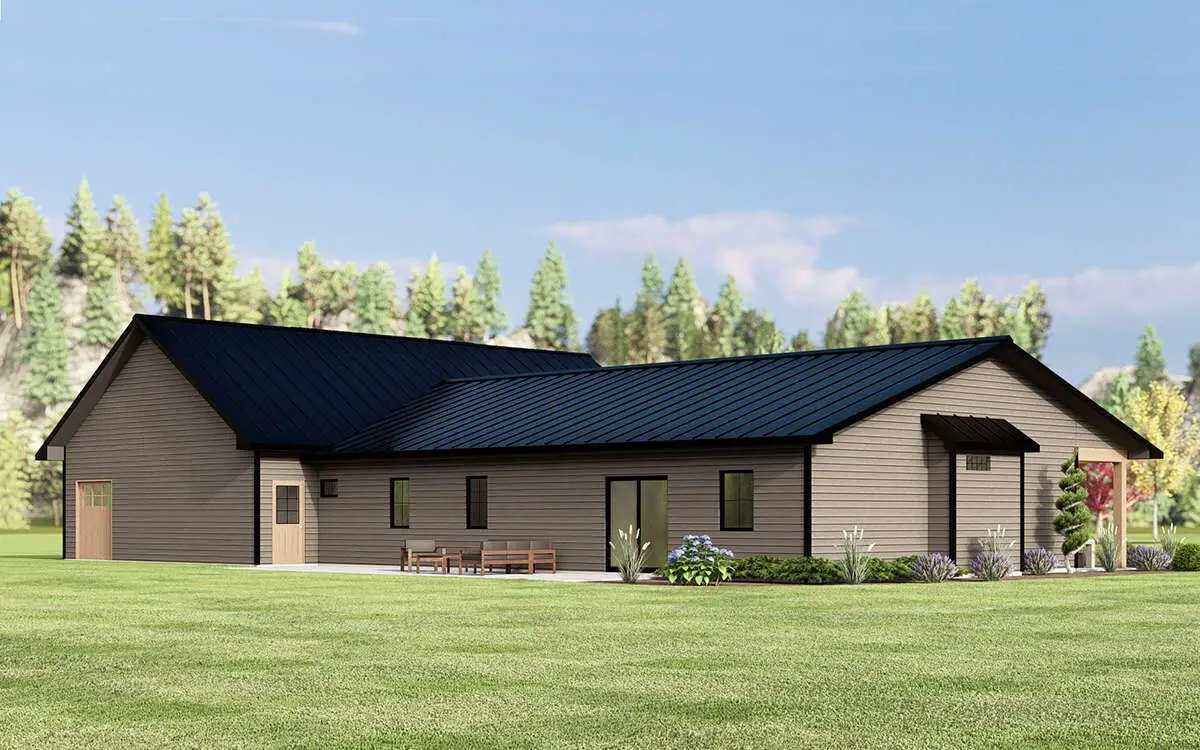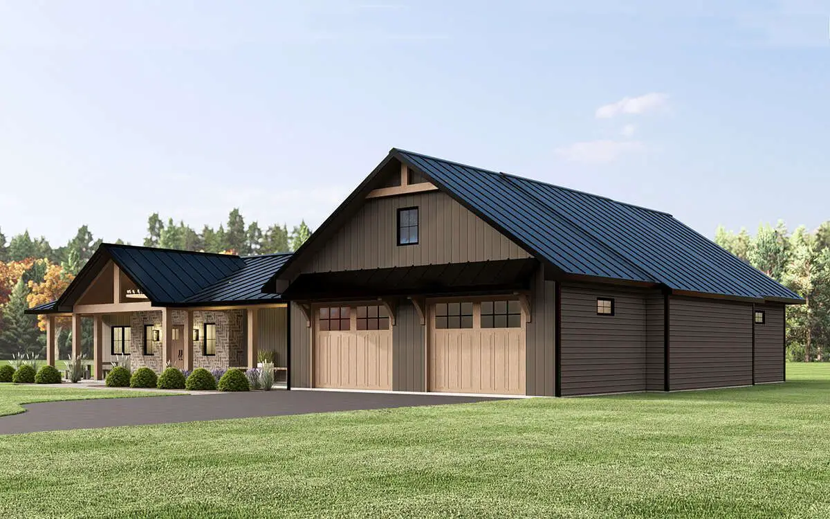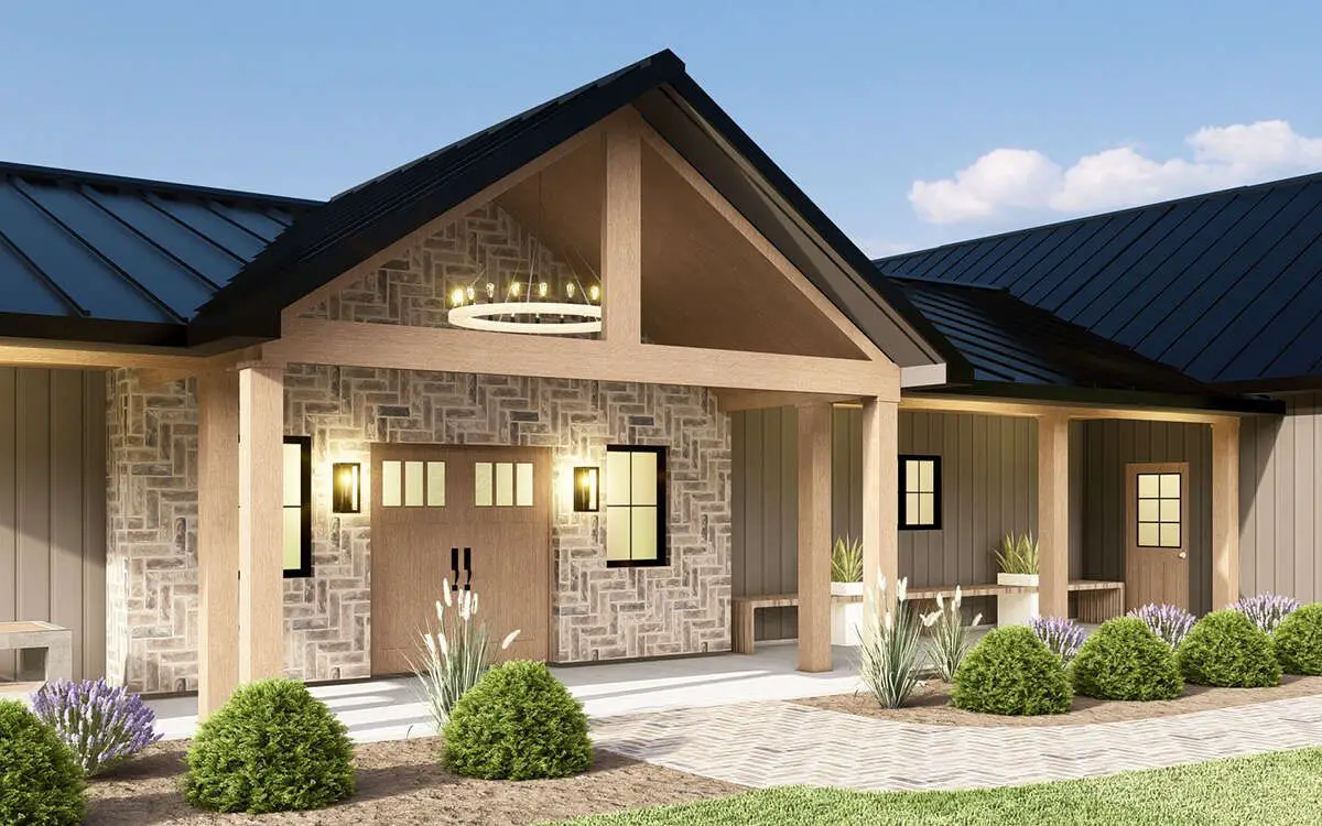 A steep roofline, wide gables, and board-and-batten siding lend the barn feel, while modest porches front and rear invite you to linger outdoors. It’s a look that blends rural sensibility with modern clarity.