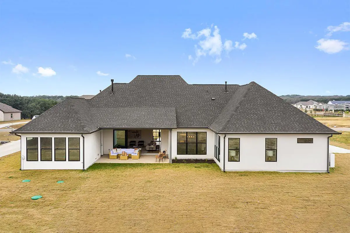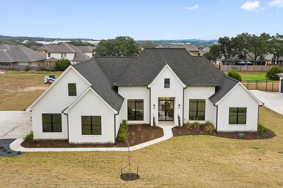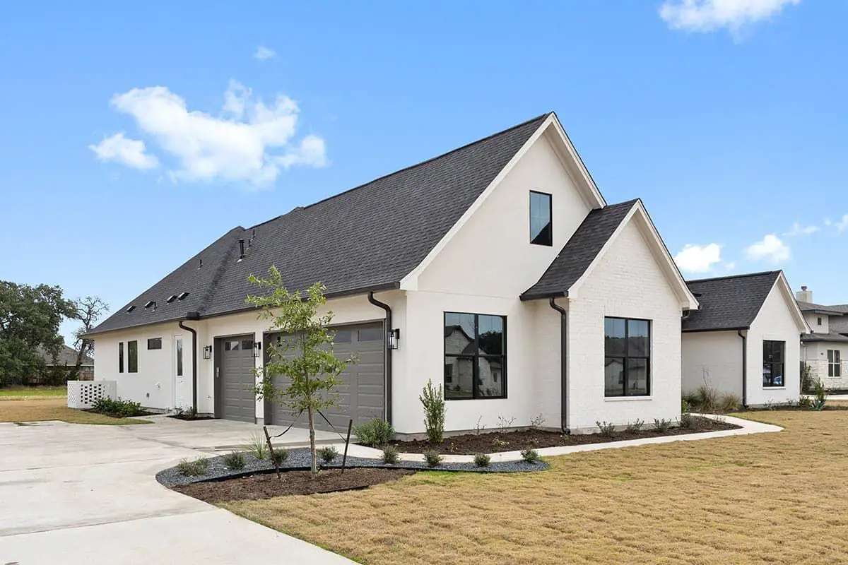 The façade mixes soft gables, clean lines, and covered porches that echo transitional appeal—neither stark modern nor fussy traditional.
