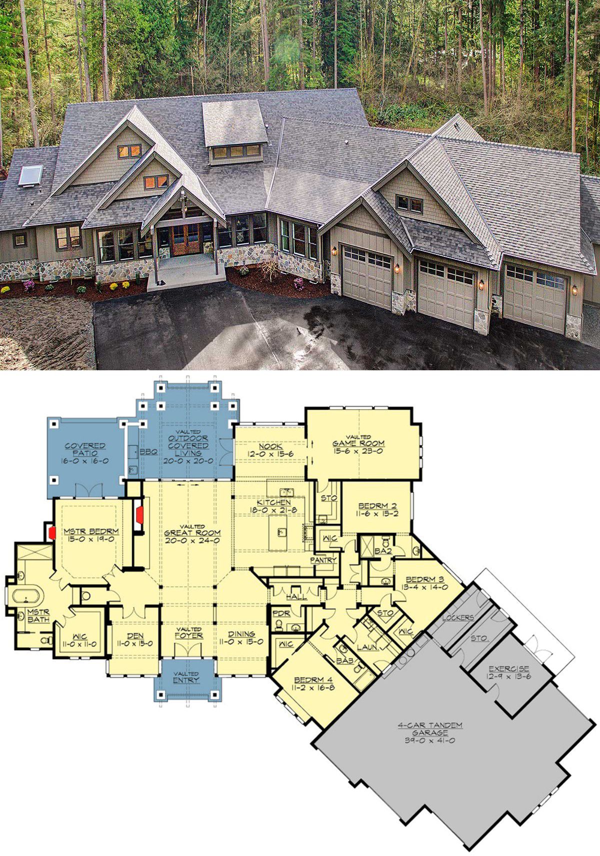 The 4-car garage appears angled, giving the front façade depth and presence.