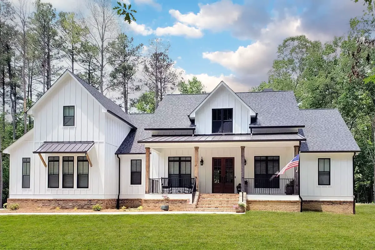 The exterior blends board-and-batten siding, crisp gables, and a broad front porch—giving you that modern farmhouse aesthetic without feeling trendy for trend’s sake.