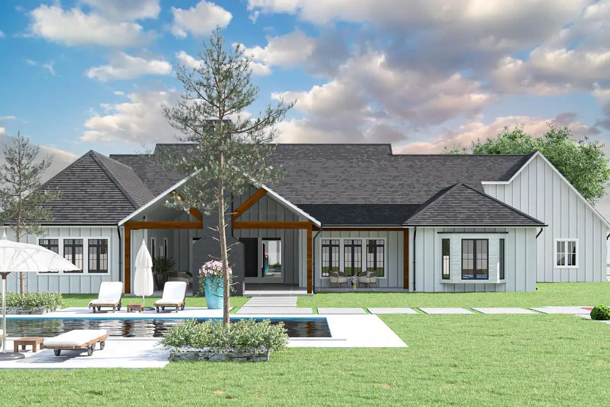 This expansive single-level transitional farmhouse plan offers around 4,187 sq ft of heated living space, featuring 4 bedrooms, 4 full bathrooms and 2 half-baths.