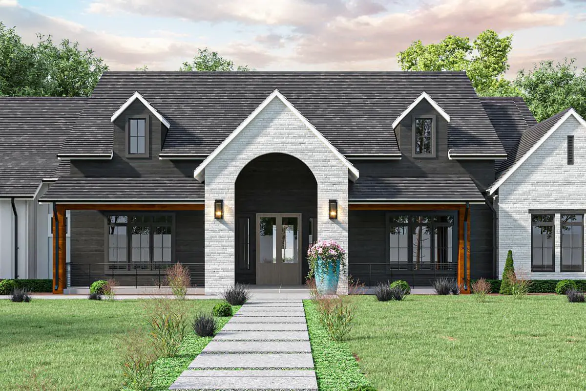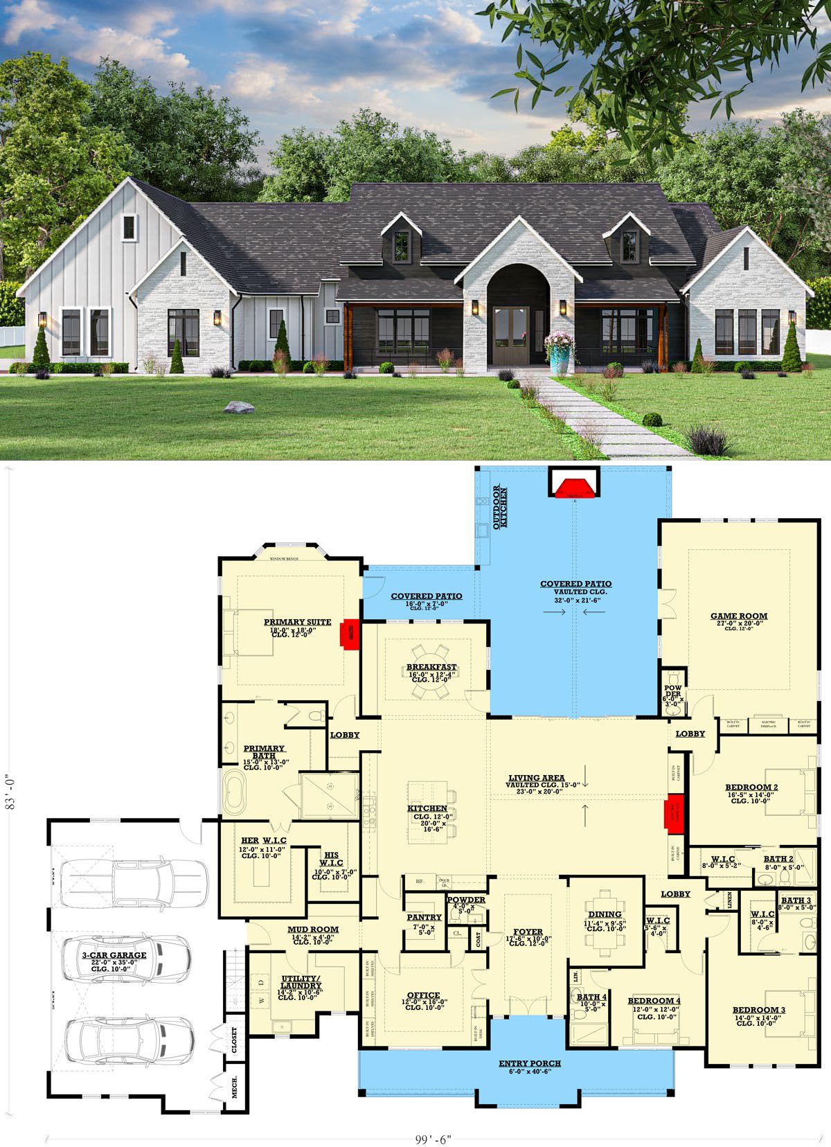 The exterior blends modern farmhouse elements and transitional details — board-and-batten, clapboard, and brick mix; a 12 on 12 roof pitch gives height and presence; the front entry porch (~300 sq ft) invites you in. Dimensions: width ~99′-6″, depth ~83′-0″, max ridge height ~27′.