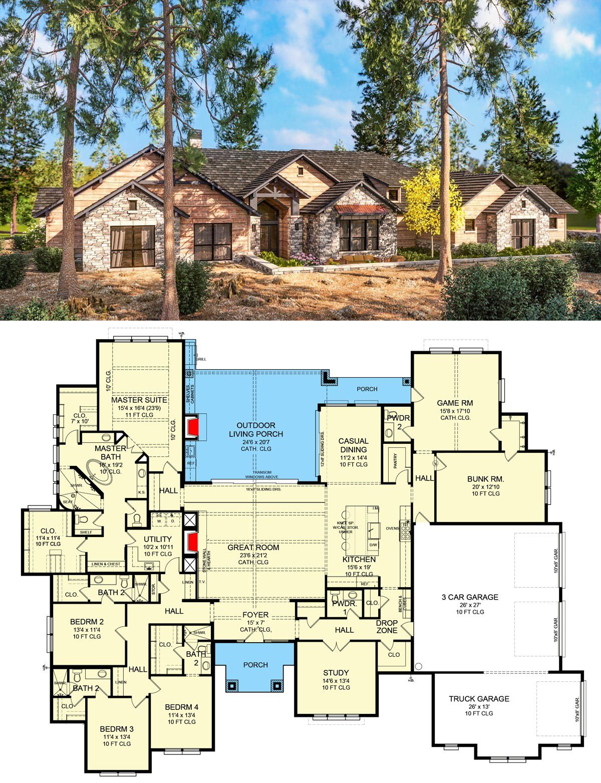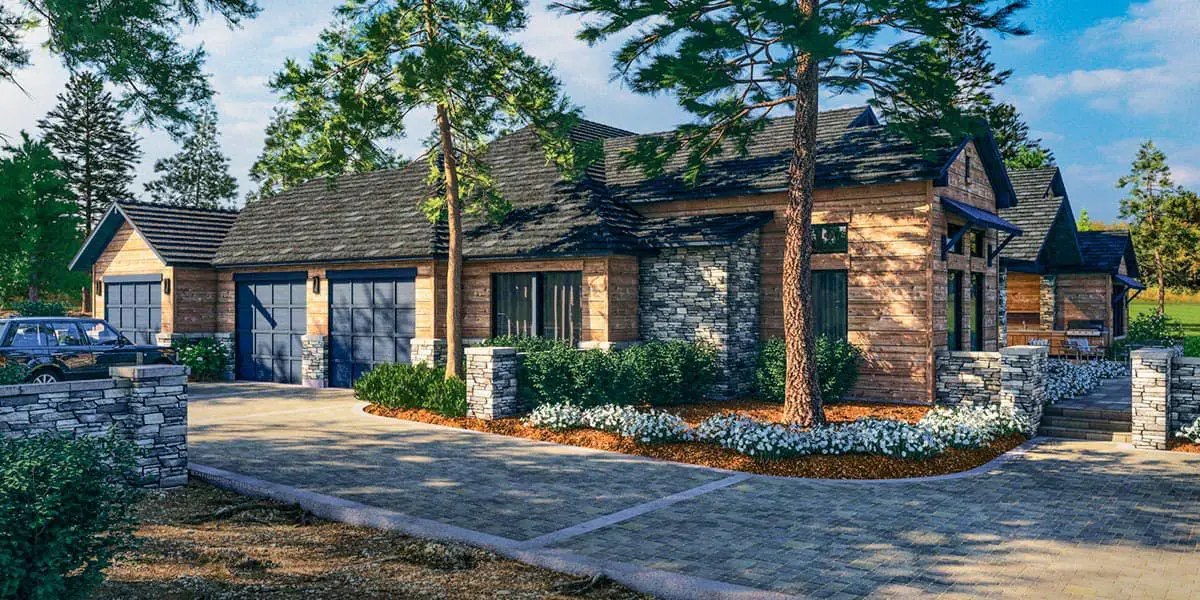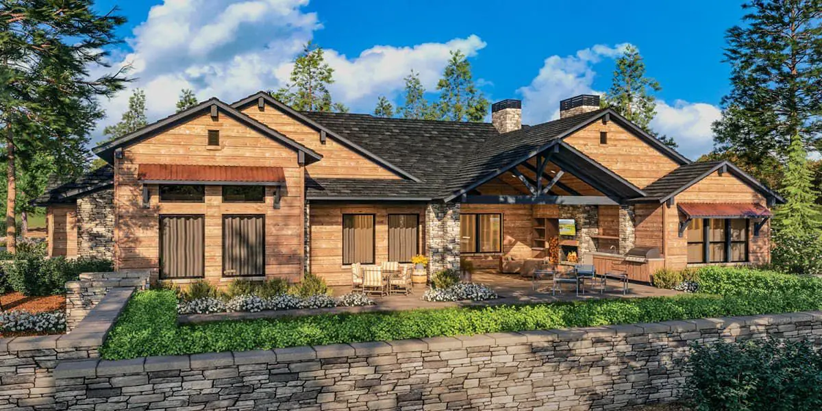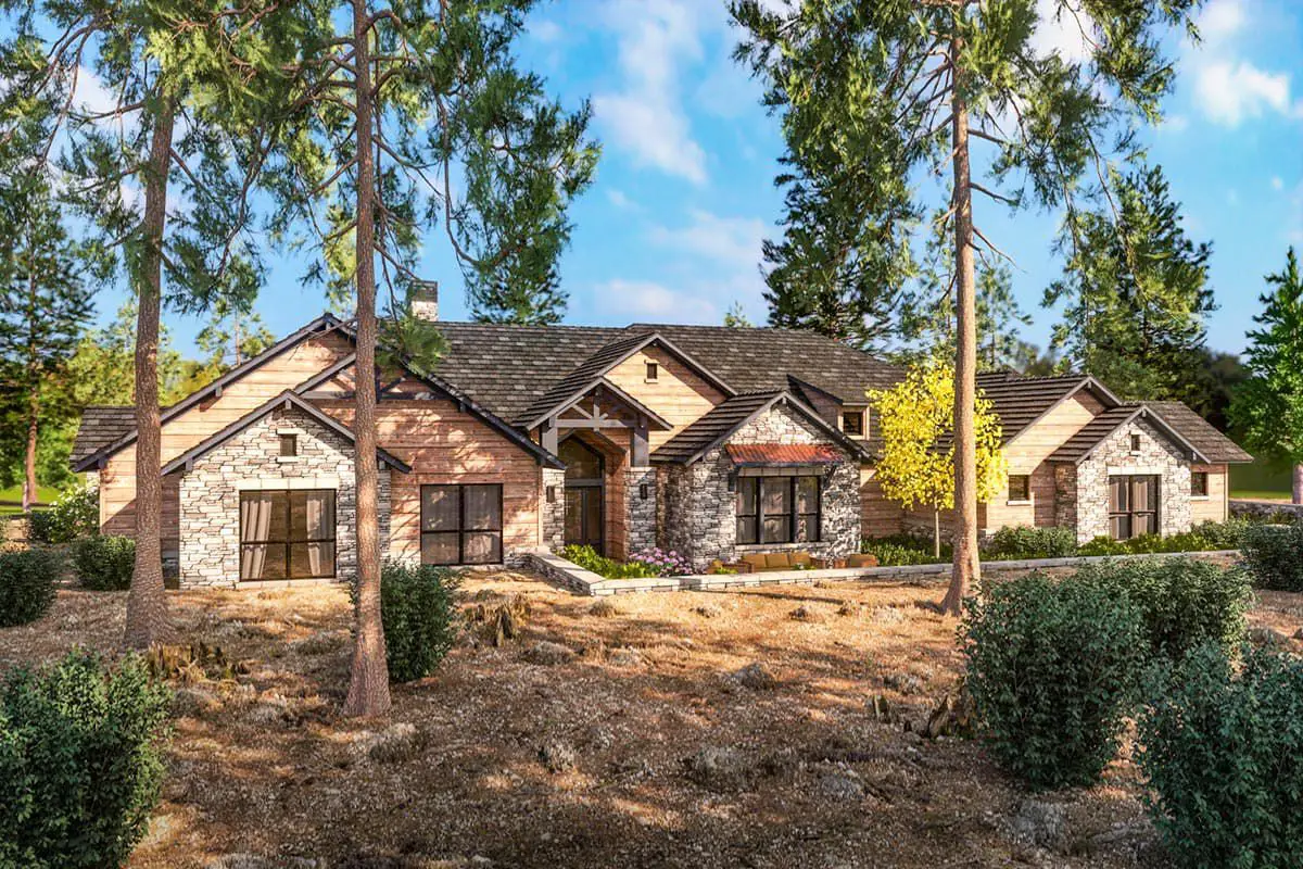 Picture board-and-batten siding or stone base, exposed rafter tails, and timber accents under gable roofs that would feel at home in a resort but very much belong with you.