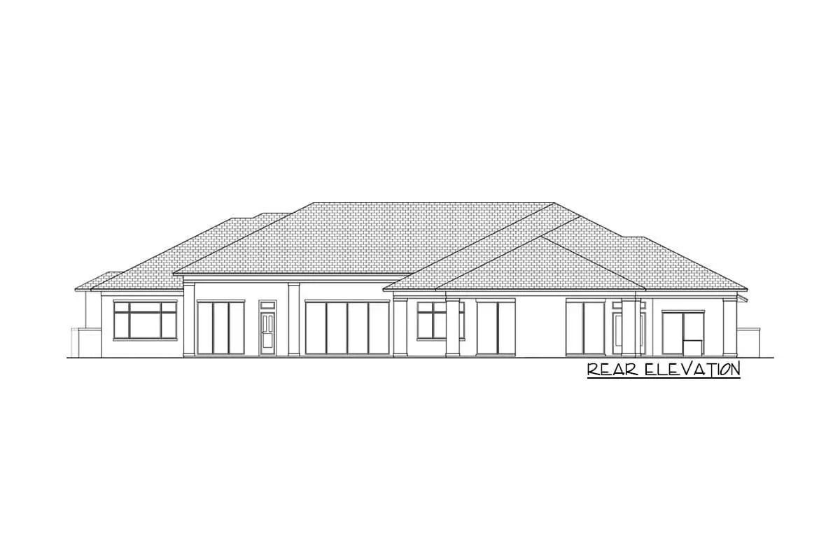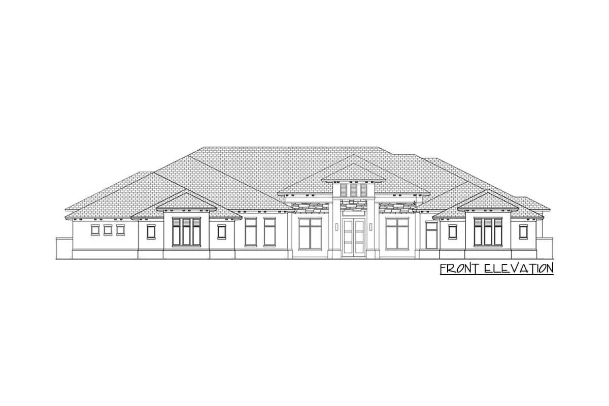 A striking feature: the attached four-car garage (~1,611 sq ft) is positioned in a courtyard format—rear of the house—and designed to integrate vehicles, storage, and access without dominating the front elevation. Width and depth reflect estate-scale living.