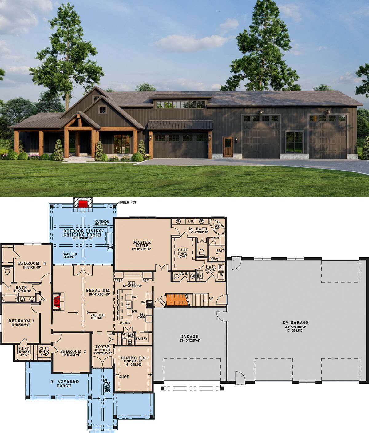 The façade stretches nearly 116′ 10″ wide × 71′ 0″ deepGarage Designed for Big Gear