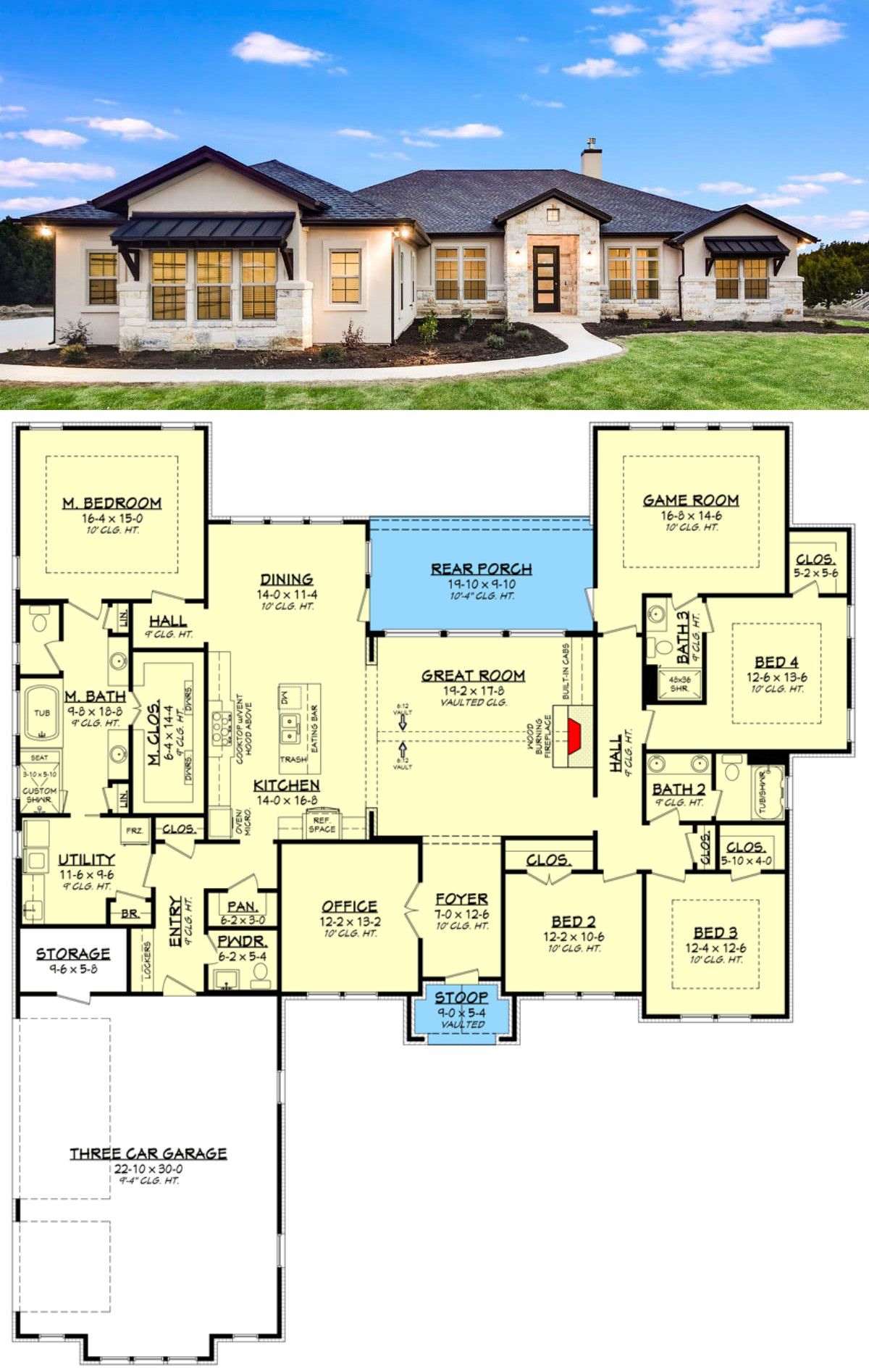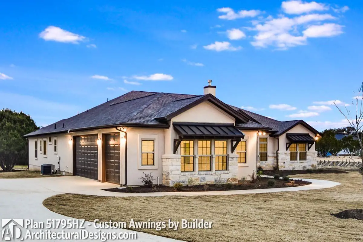 The exterior brings together stone and stucco for that ranch feel, while oversized flanking windows around the entry elevate it from “cute cottage” to “this is the one.” The landscaping? Optional. The swagger? Built-in.