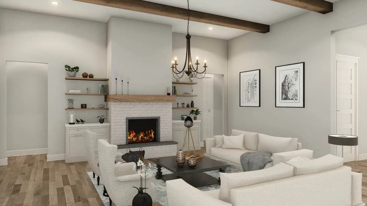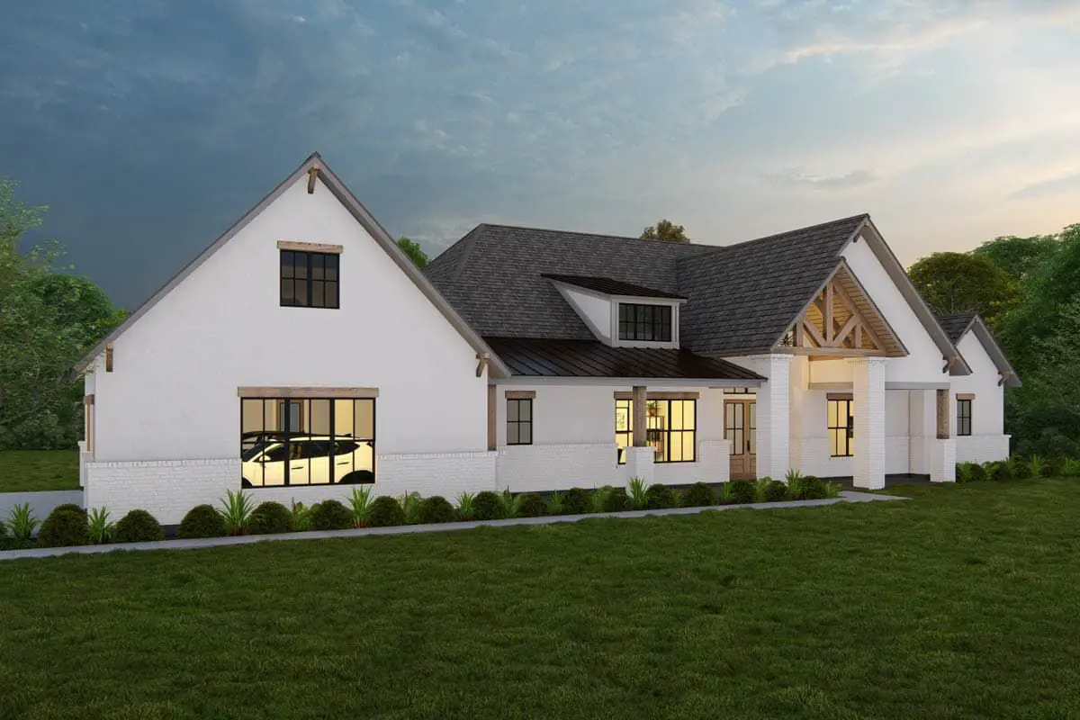 The exterior blends painted brick, board-and-batten siding, and timber accents for that elevated “Modern American” aesthetic.