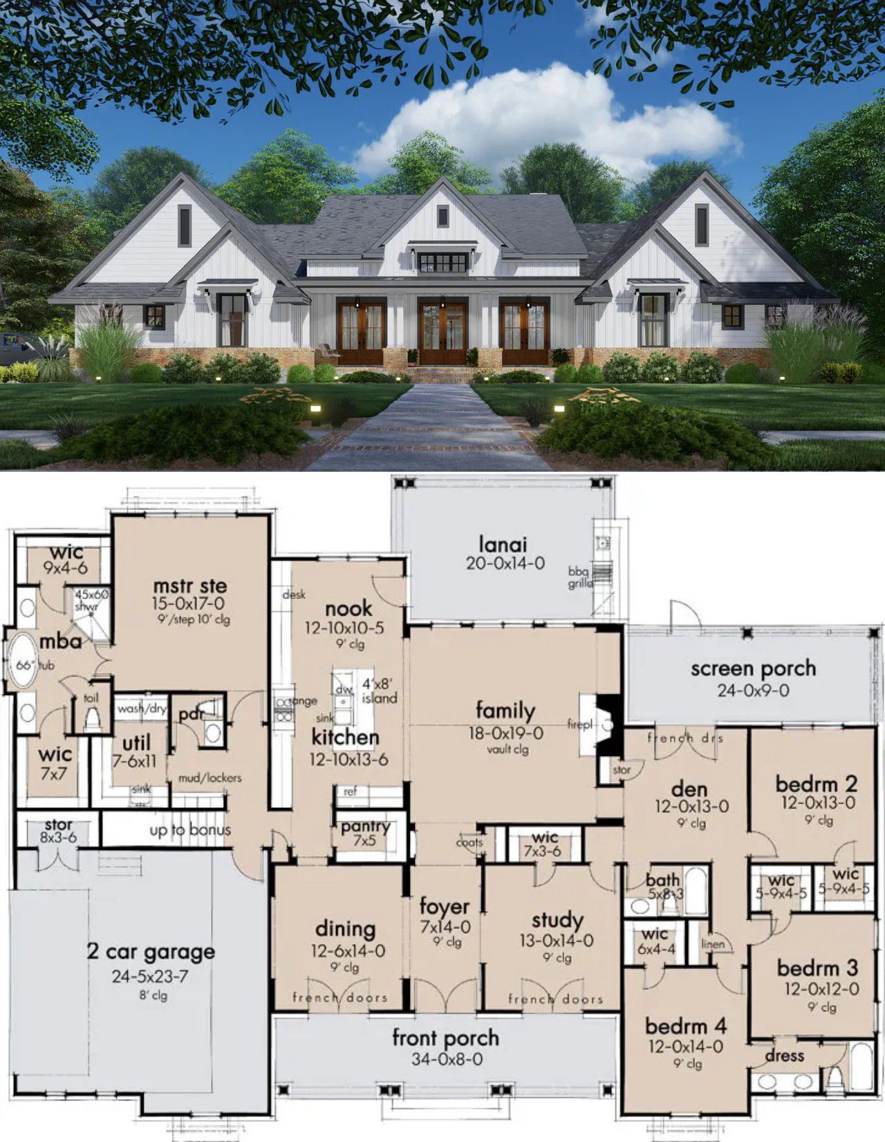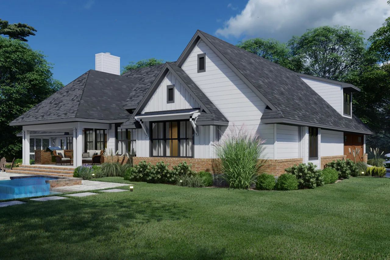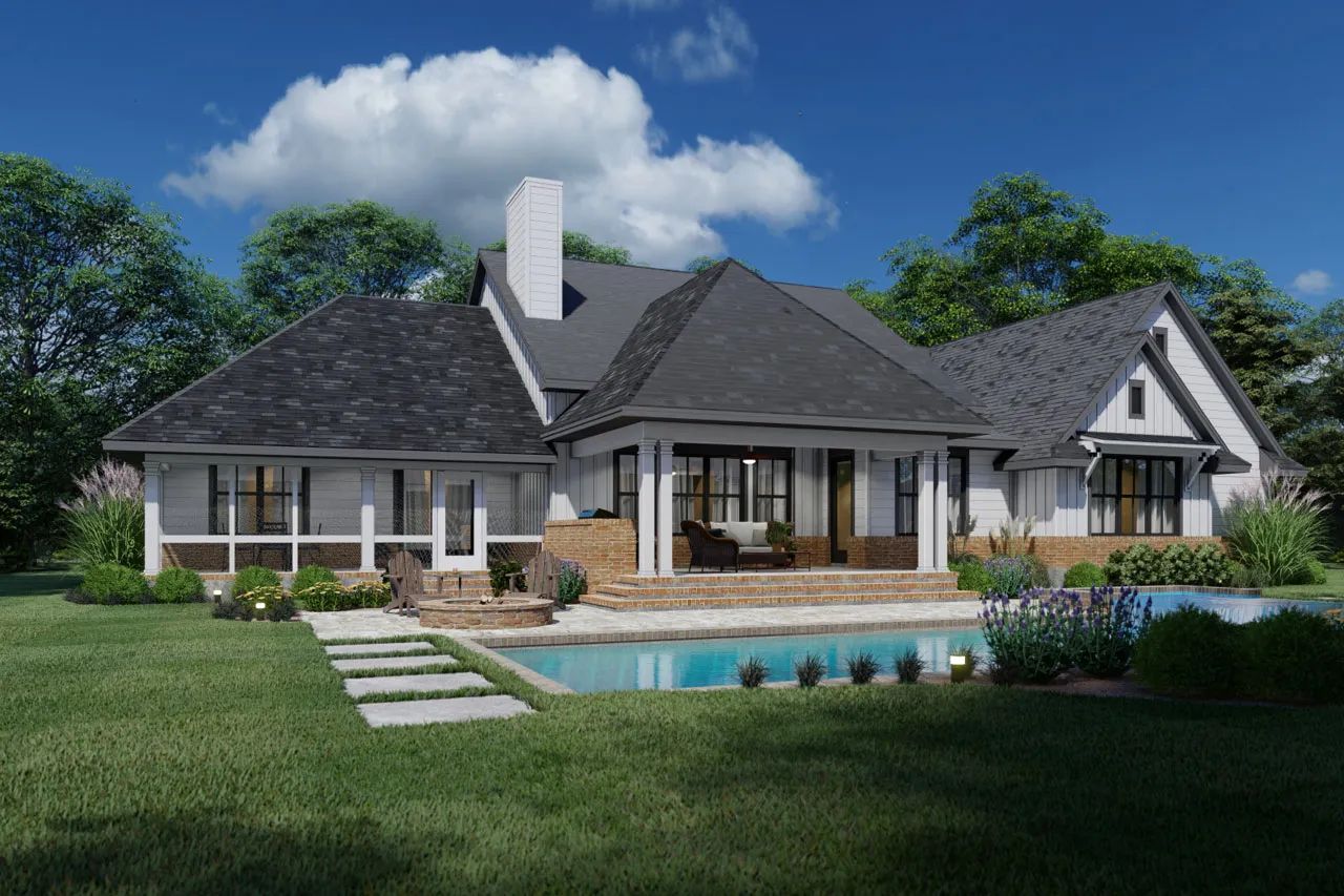 It merges relaxed farmhouse style with smart design touches like a large island kitchen, open great room, and split‐bedroom zones—all under one roof.