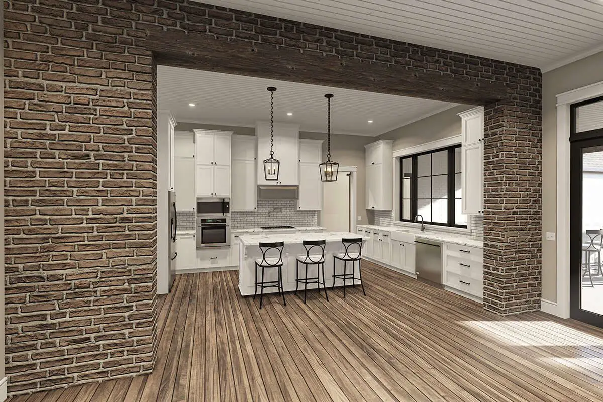 The kitchen is built for modern life—ample counter and island space, direct connection to dining, and straight access to the outdoor porch, which is 16′6″ deep and features its own fireplace plus outdoor kitchen capability. 4 It’s casual enough for everyday, elevated enough for weekend hosting.