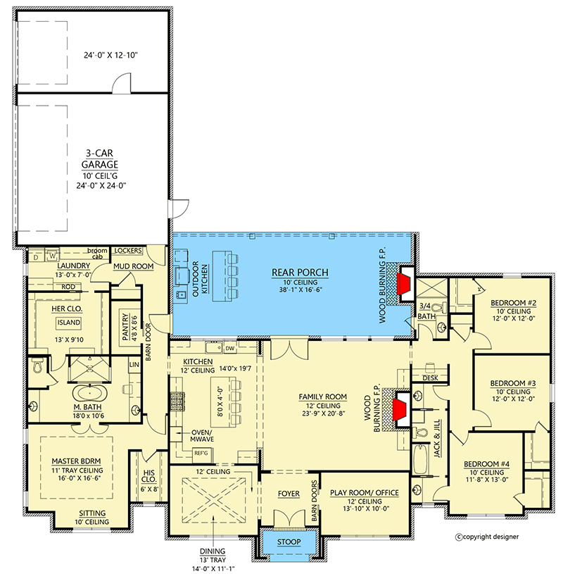 | Special Features | Rear porch with fireplace, flex room, tray ceilings, efficient flow |