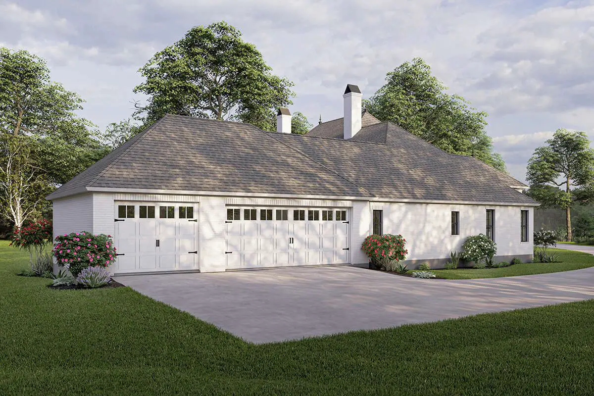 The attached 3-car garage provides ample storage and links fluidly into the mudroom and kitchen circulation. Its placement supports the symmetry of the exterior while delivering practical access behind the scenes.