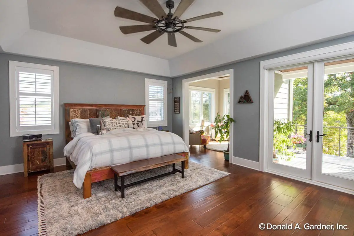 On one side you’ll find the master suite with a vaulted sun-room annex (12′-6″ vaulted ceiling) just off the bedroom—ideal for early morning coffee, reading, or soaking in the view. Dual walk-in closets and a luxury ensuite finish the space in style.