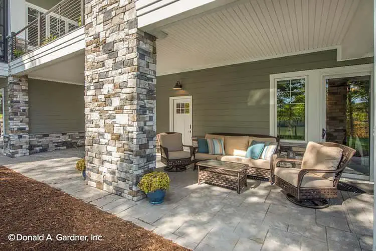The façade is classic craftsman meets mountain elegance: stone-and-shake, staggered gables, a deep 28′-6″ wide front porch with 12′ ceiling height, and a side-entry 3-car garage. It’s built for a sloped lot with a walk-out lower level in mind.