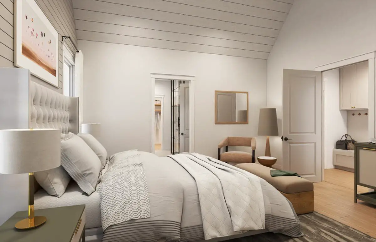 Your master suite is tucked away for maximum privacy and comfort. It includes French doors to the rear porch, a cathedral-ceiling bedroom, a luxurious five-fixture bath, and a huge walk-in closet that connects to the laundry room—smart layout for ease.