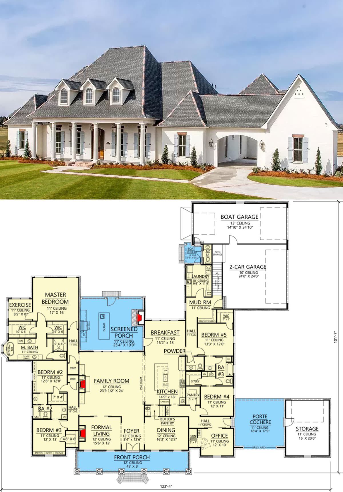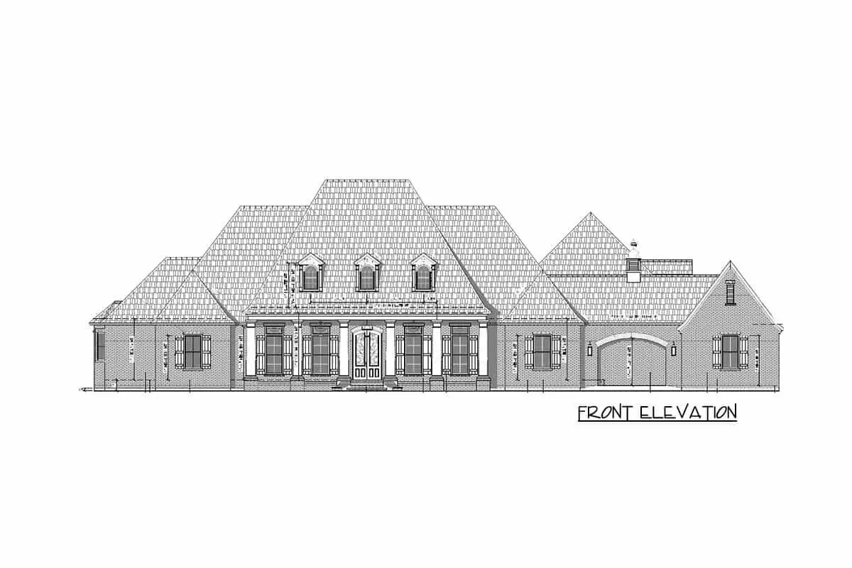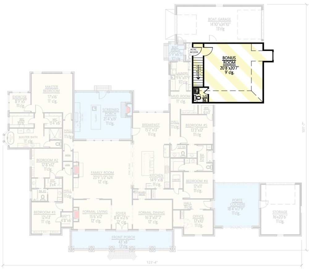 This striking Southern-style design offers around 4,443 sq ft of heated living space in one level, plus bonus room space.