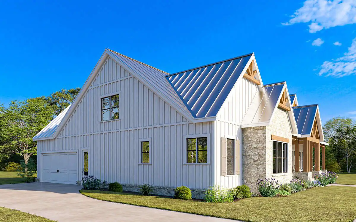 The home spans 76′ 7″ wide × 63′ deep. 1 The exterior is classic farmhouse with clean lines, a steep 9:12 roof pitch, and large windows that frame the porch and yard.