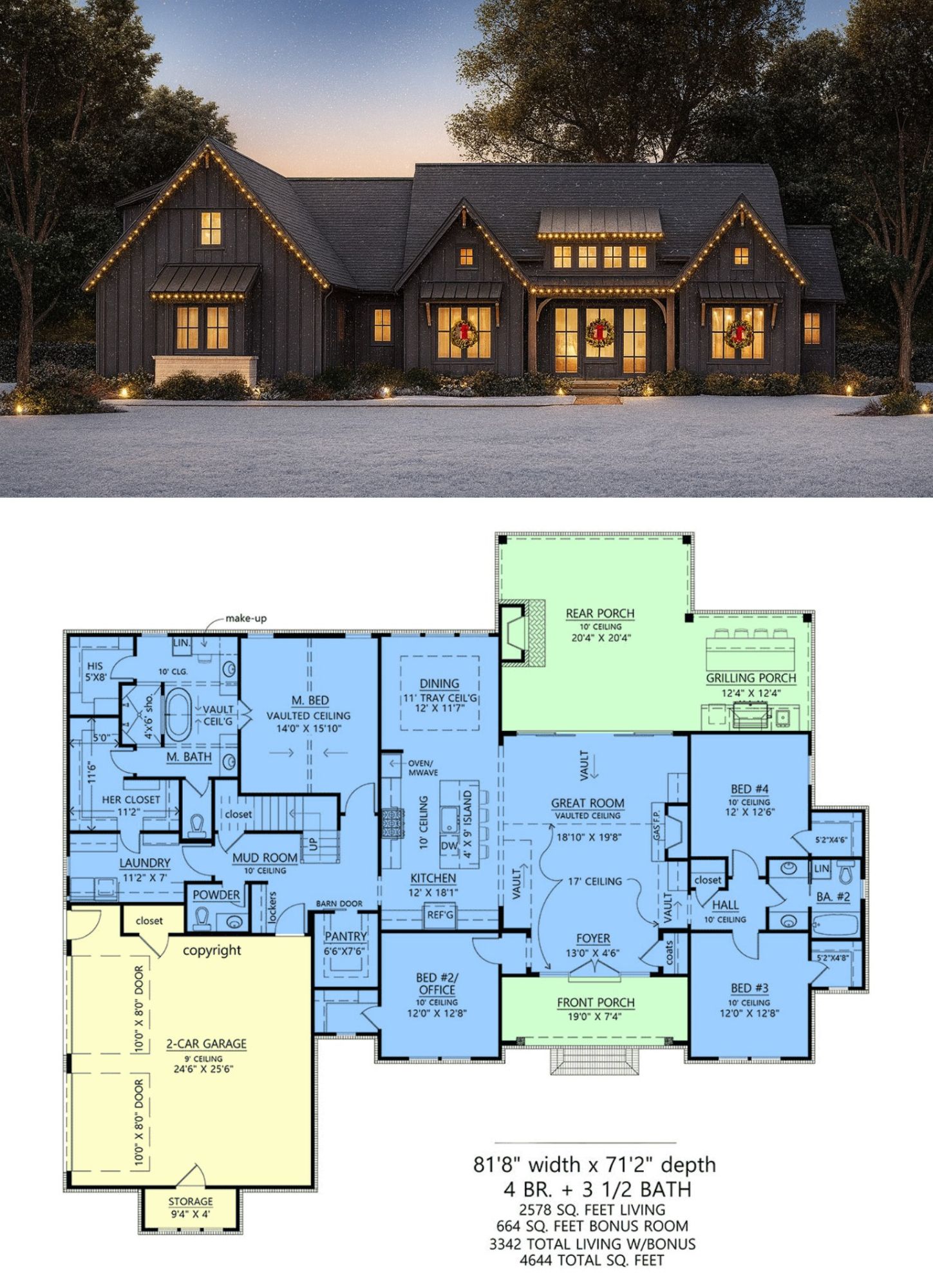 At roughly 2,578 square feet, it offers four bedrooms (with an optional fifth), three full baths plus a powder room, generous porches, and flexible bonus space — all arranged to support everyday family life and effortless entertaining.