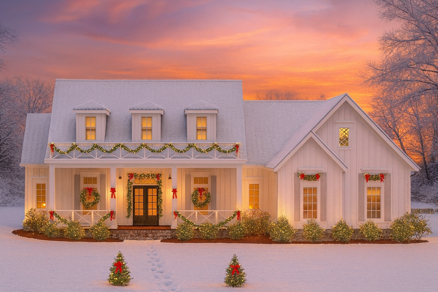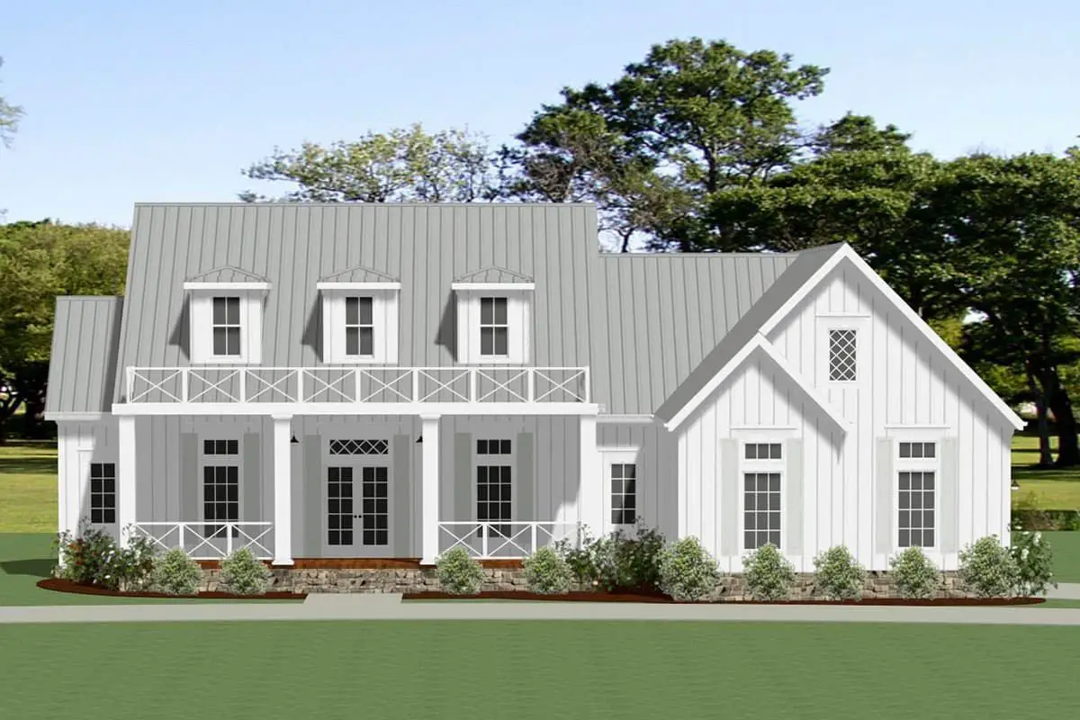 - Classic farmhouse curb appeal with balanced proportions and welcoming porches.