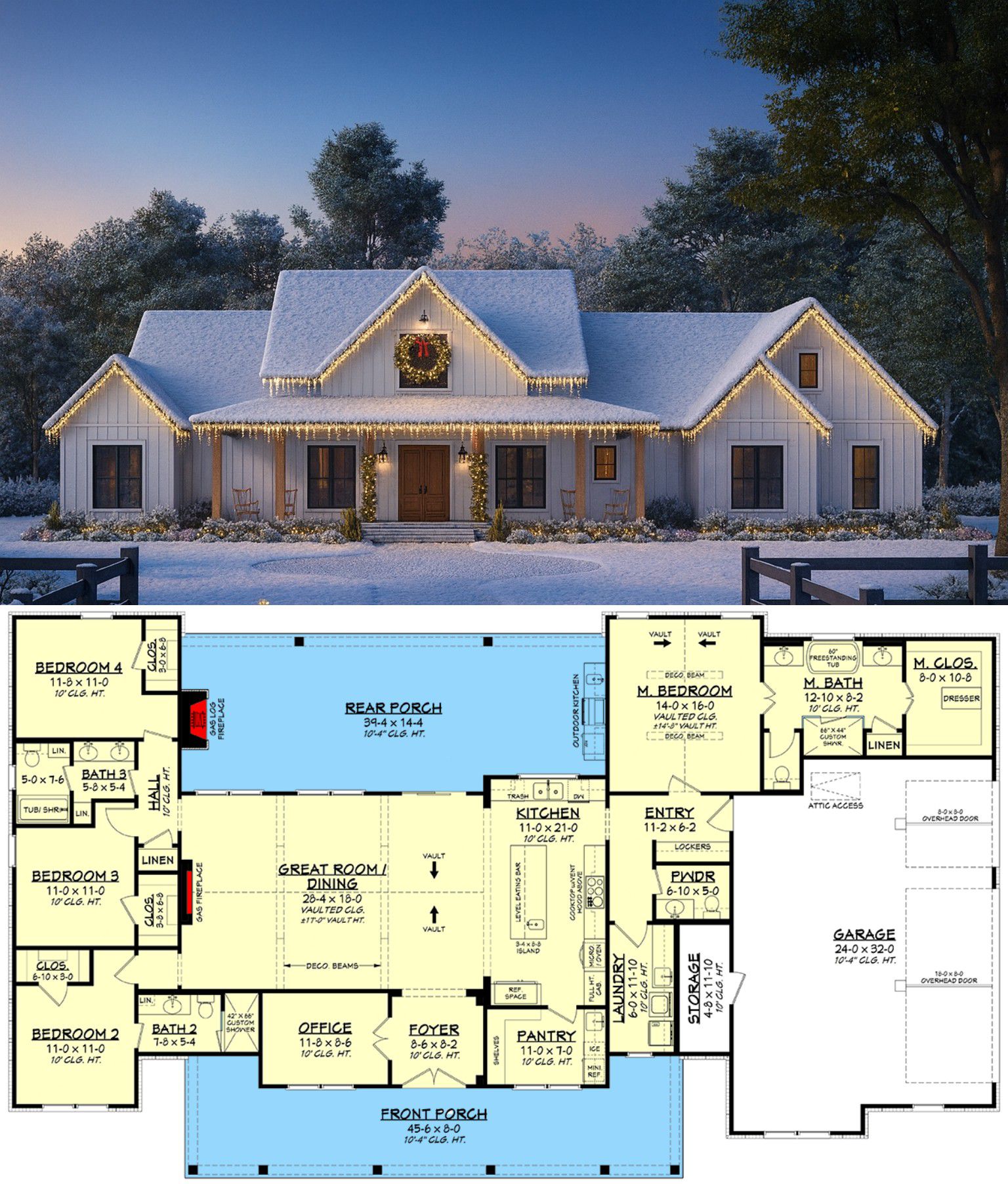 Here’s a home plan that blends modern farmhouse charm with clever practicality — a cozy, yet spacious 2,500-square-foot design, featuring four bedrooms, a home office, and plenty of outdoor living space.
