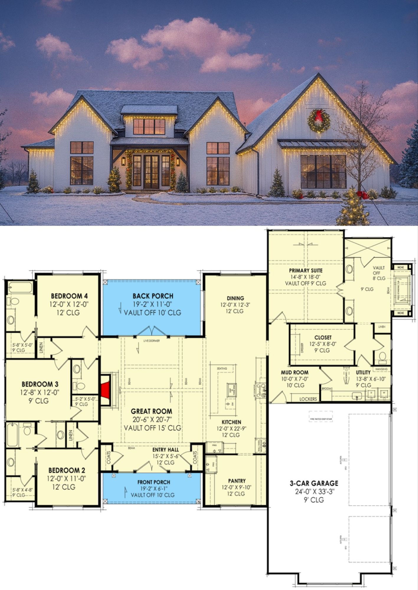 This plan is ideal for families or individuals who want a home that combines modern farmhouse charm with smart, functional layout.