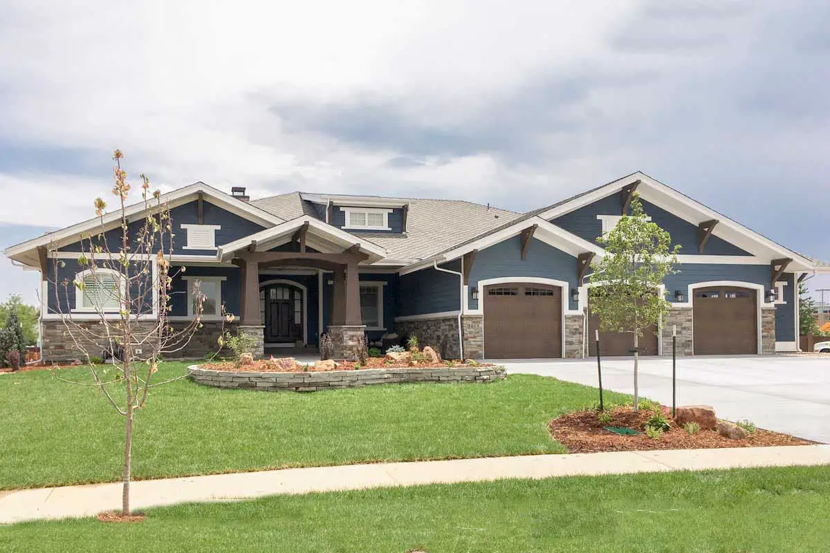 The exterior reflects rustic-craftsman character: think mixed materials, deep overhangs, and a strong sense of vertical and horizontal lines that evoke a mountain-style lodge.