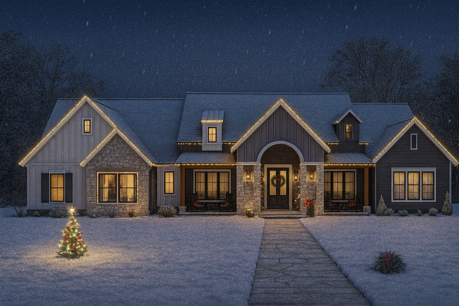 This 4,187-square-foot transitional-style farmhouse plan delivers on both comfort and entertainment — with 4 bedrooms, 4 full baths + 2 half-baths, a roomy 3-car garage, and a massive indoor game/rec room plus generous outdoor living space.