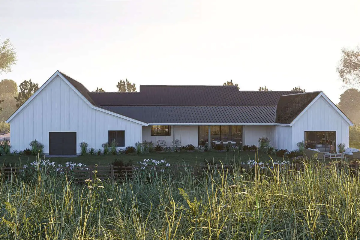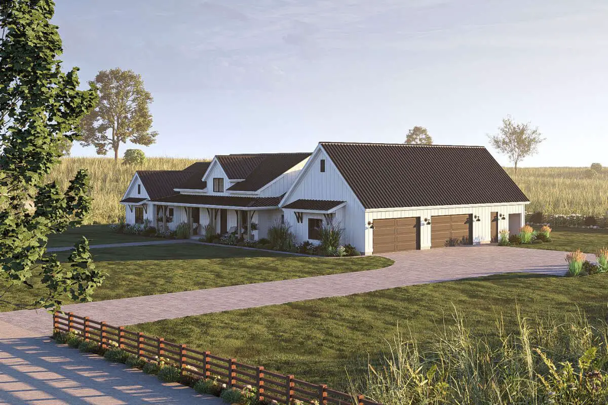 This modern farmhouse plan delivers the best of both worlds: it feels generous and impressive, but still warm, welcoming, and easy to live in. You get wide-open social spaces, a calm and private primary suite, kid- and guest-friendly bedrooms, big porches, and a 4-car garage that’s ready for whatever life brings.