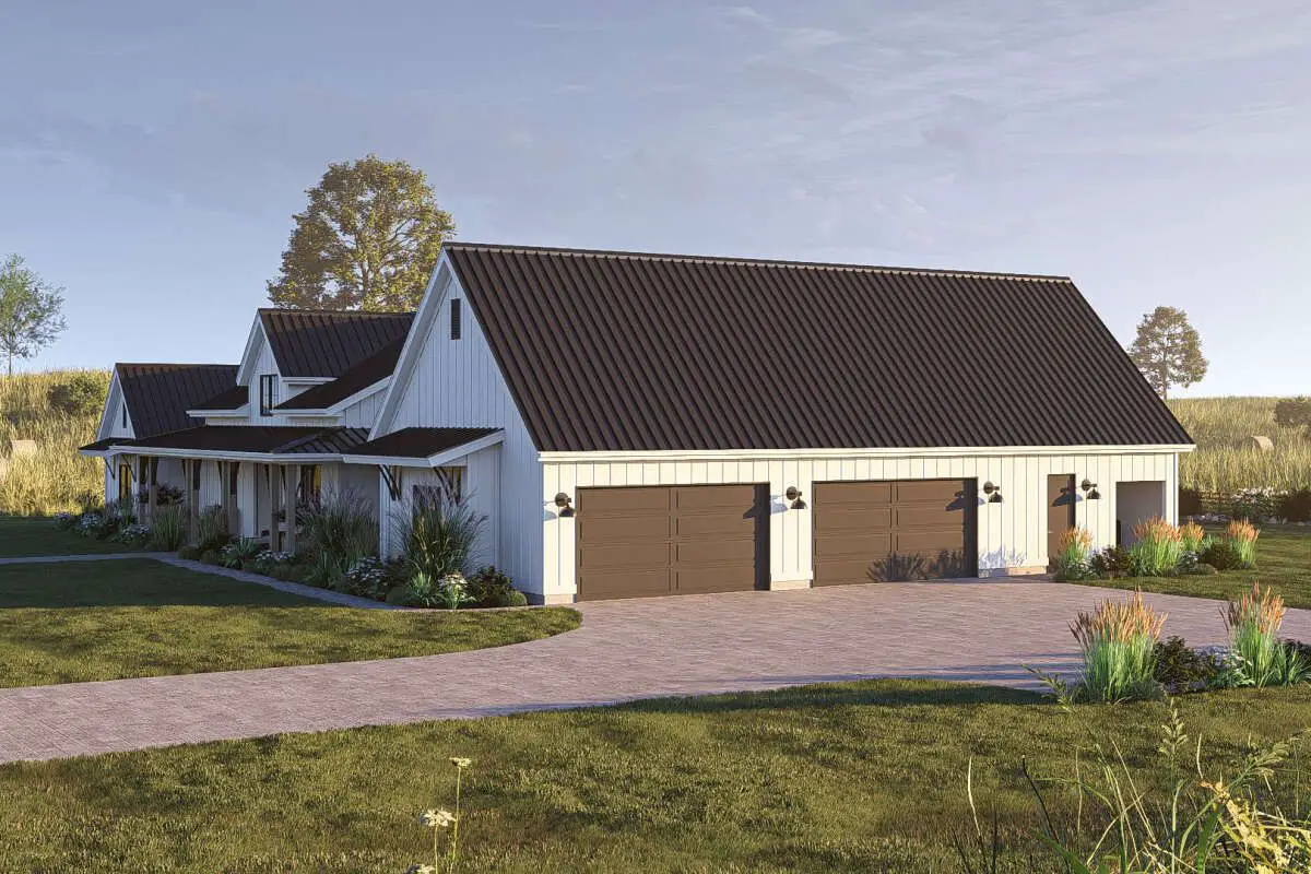 The 4-car side-entry garage keeps the front elevation house-focused instead of garage-door-focused. From the curb, what you notice is the architecture, the porch, and the windows – the garage simply tucks onto the side and quietly does its job.