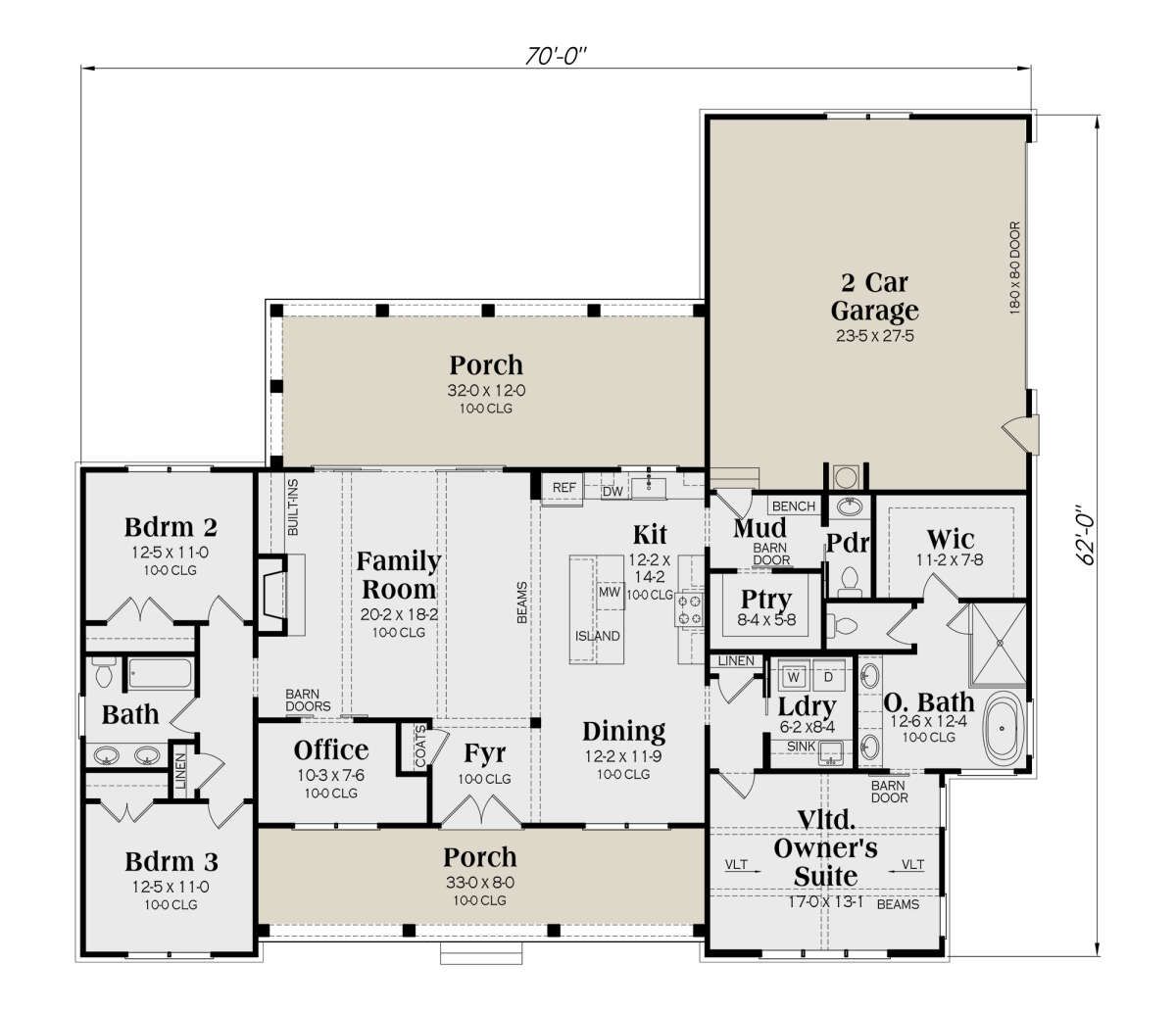 This plan uses a split-bedroom layout, which basically means the primary suite is on one side of the house and the secondary bedrooms are on the opposite side. That gives everybody privacy and keeps noise down.