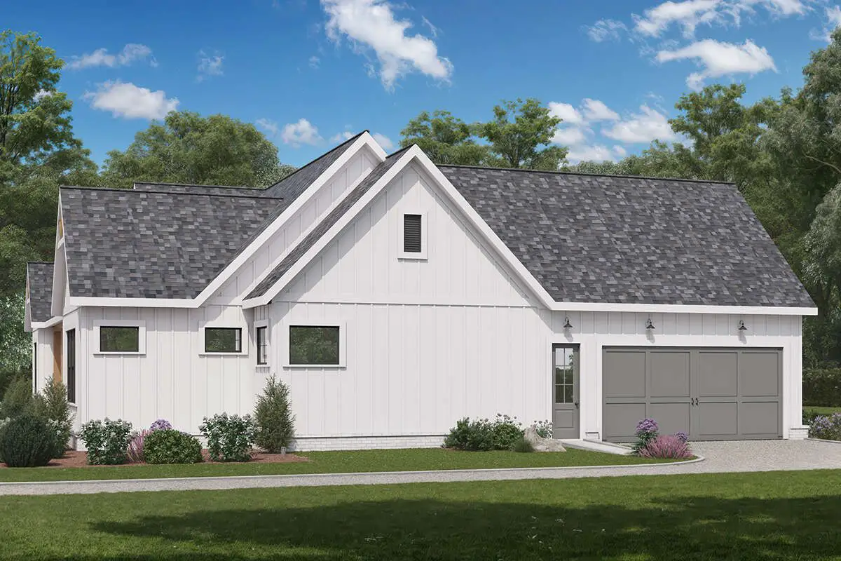 The side-entry garage keeps the front elevation clean so the first thing people see is the house and porch, not three big garage doors.