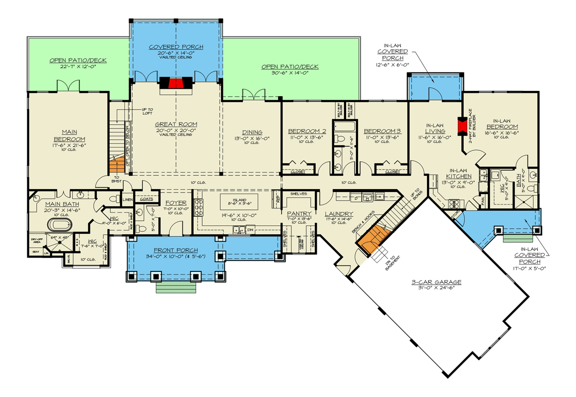 One of the standout features is the dedicated in-law suite included in the plan’s total living area. It comes with its own kitchen, a porch, and a two-sided fireplace — offering privacy and independent living for guests, older family members, or long-term visitors.