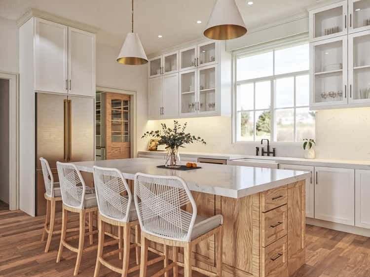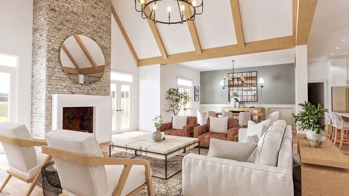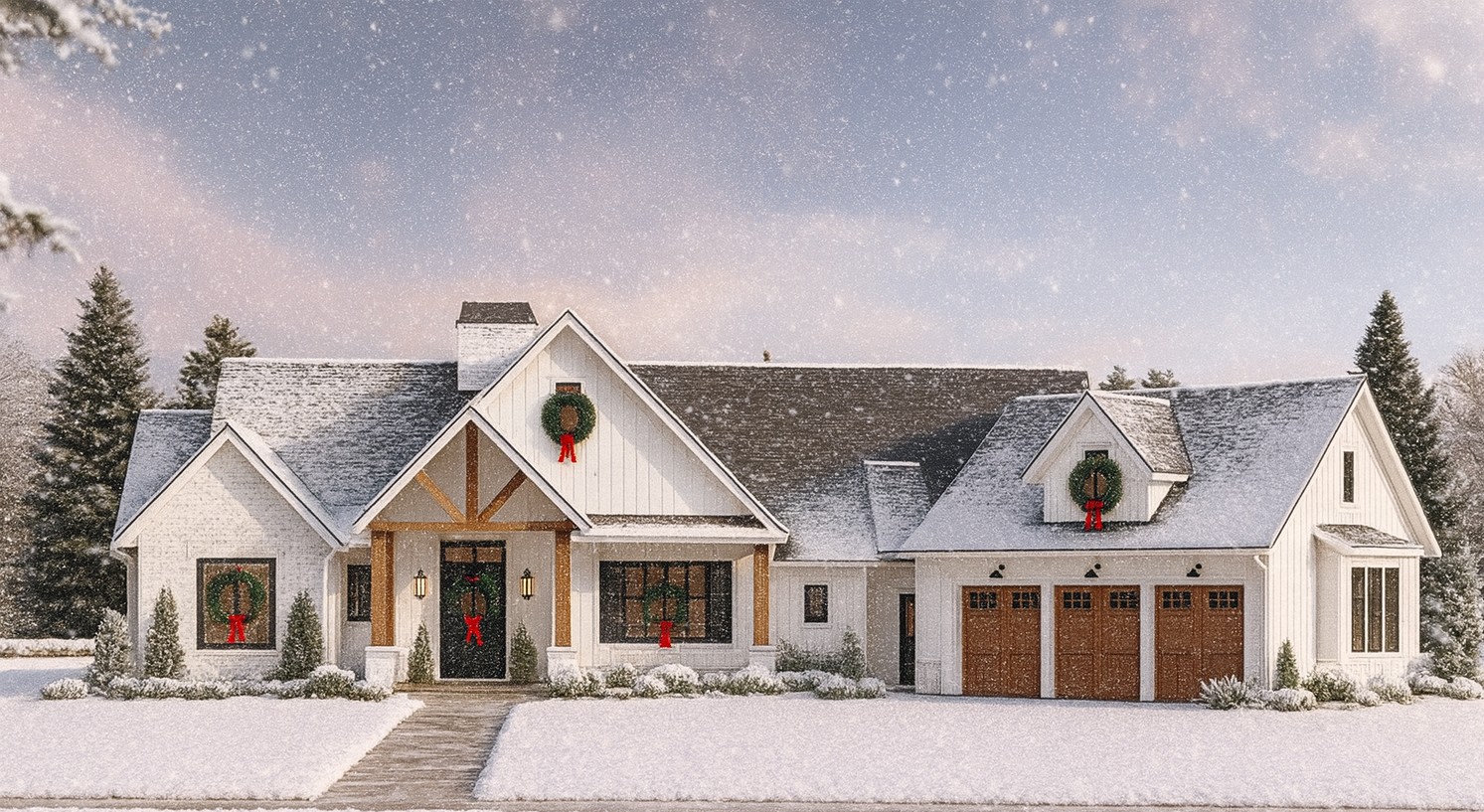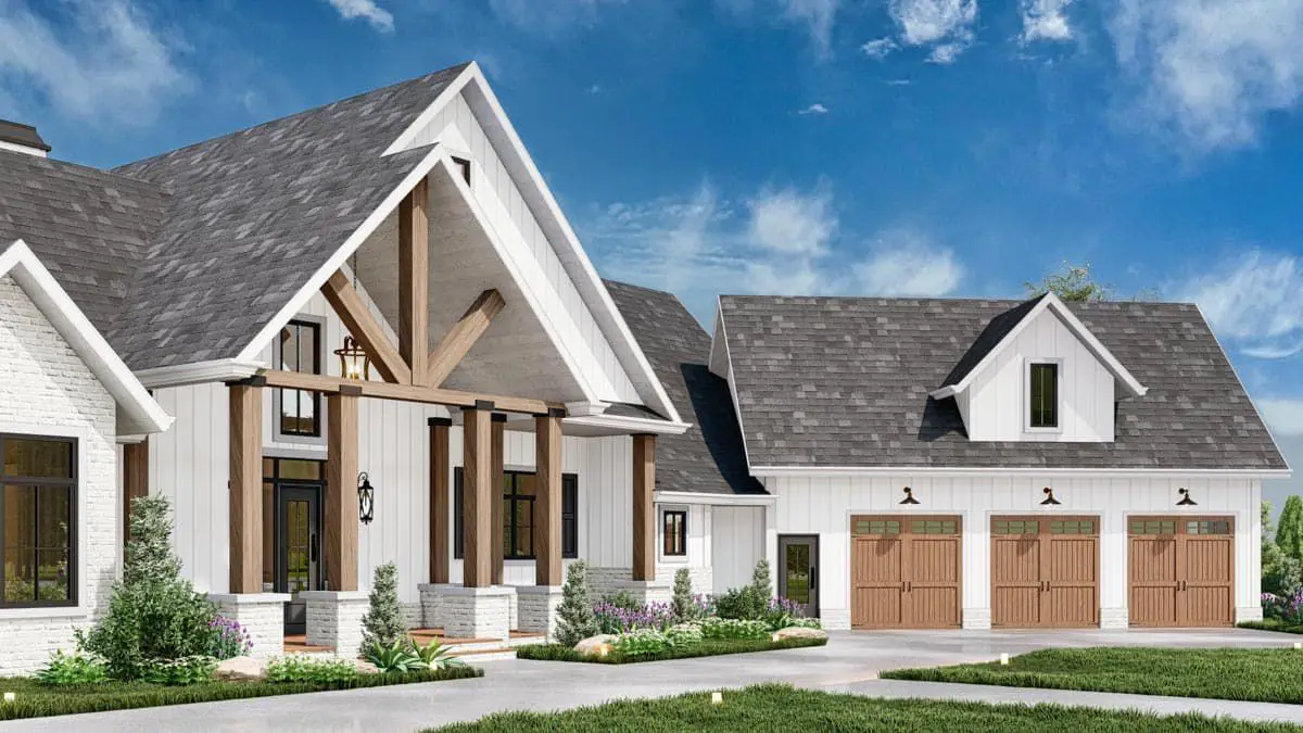 Timber-frame accents, vaulted rooflines, and well-placed gables add warmth and farmhouse charm while keeping the overall design fresh and contemporary.