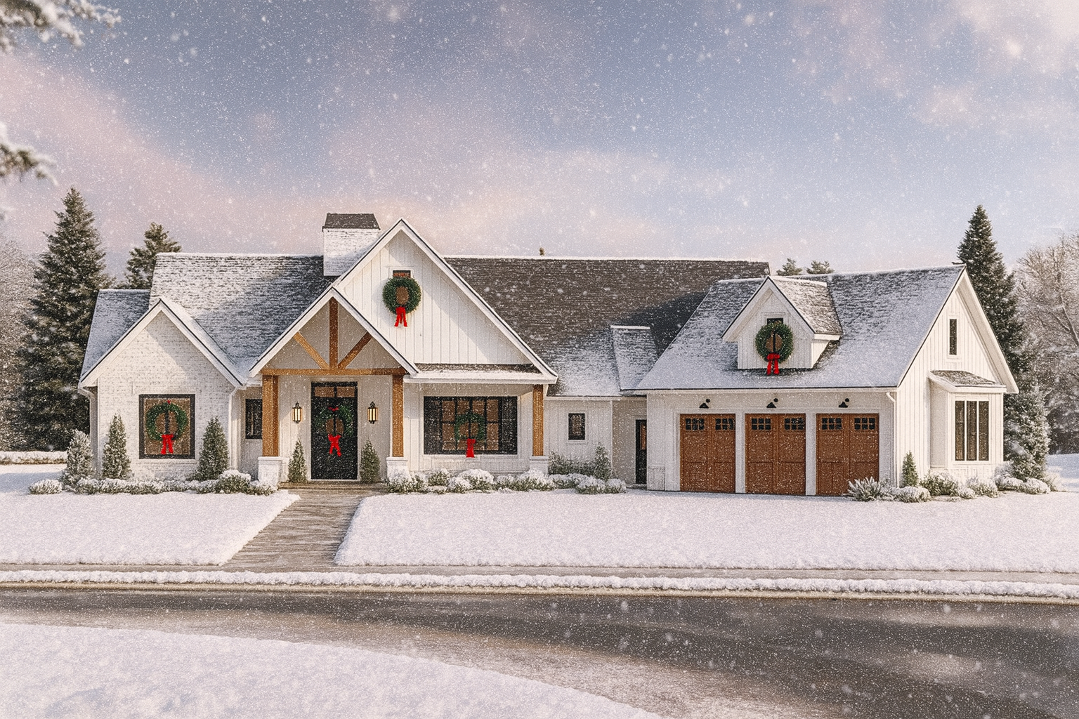 The exterior presents a classic modern-farmhouse aesthetic: clean lines, a welcoming covered front porch entry, and a 3-car angled garage that adds depth and character — avoiding the “big box garage” look and preserving a home-first façade.