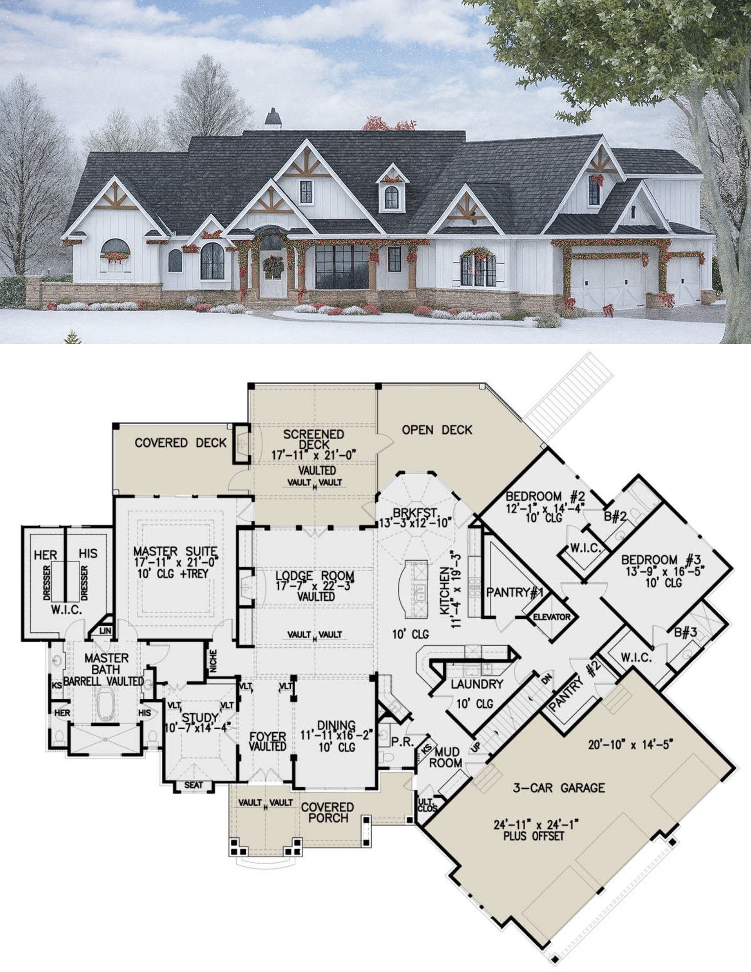 The plan uses a split-bedroom layout on the main level: the master suite enjoys privacy and direct access to a covered deck and adjacent study, while two secondary bedrooms remain on the main floor for convenience and balance.