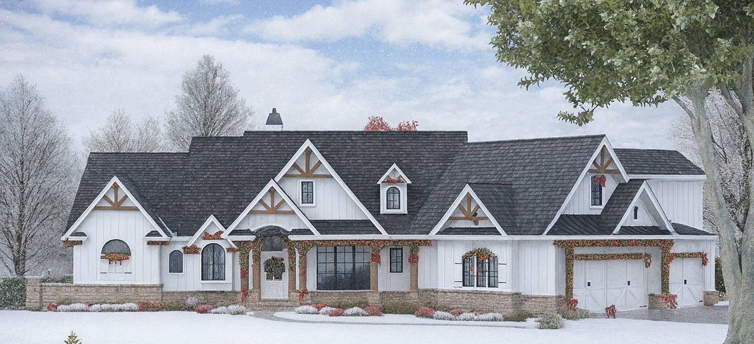From the curb, the house presents a refined Craftsman façade with balanced proportions and a wide footprint (≈106′-2″ wide x 87′-4″ deep).