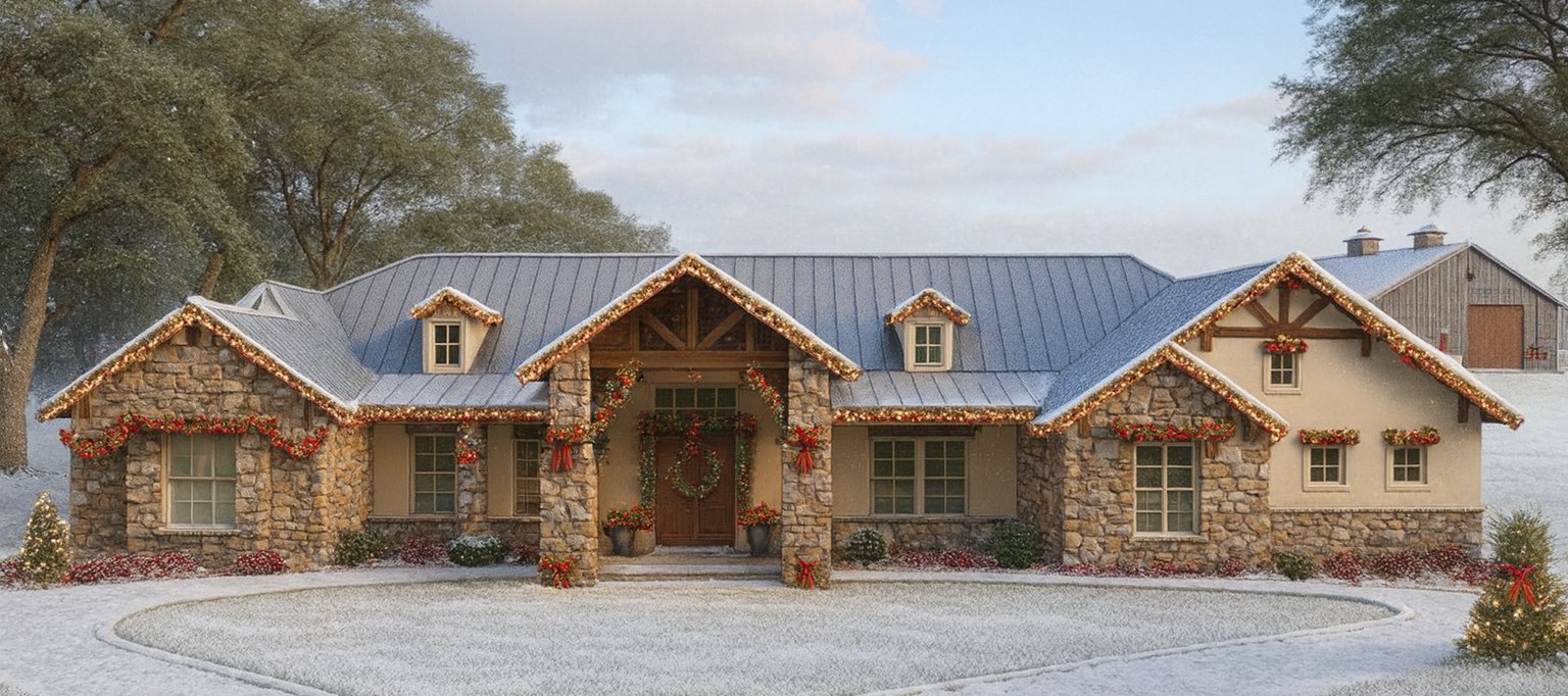 This expansive Hill-Country home plan provides about 4,383 sq ft of luxury living — with **4 bedrooms** and **4½ bathrooms** — delivering a thoughtful blend of elegance, generous indoor-outdoor flow, and special-purpose spaces for work and leisure.