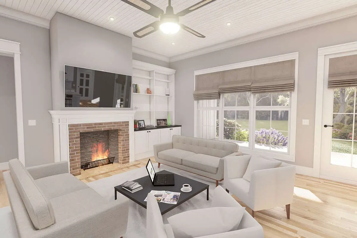 With a 3-car side-load garage, generous indoor-outdoor flow including an outdoor kitchen and fireplace, and flexible living zones, this plan combines modern comfort with farmhouse charm.