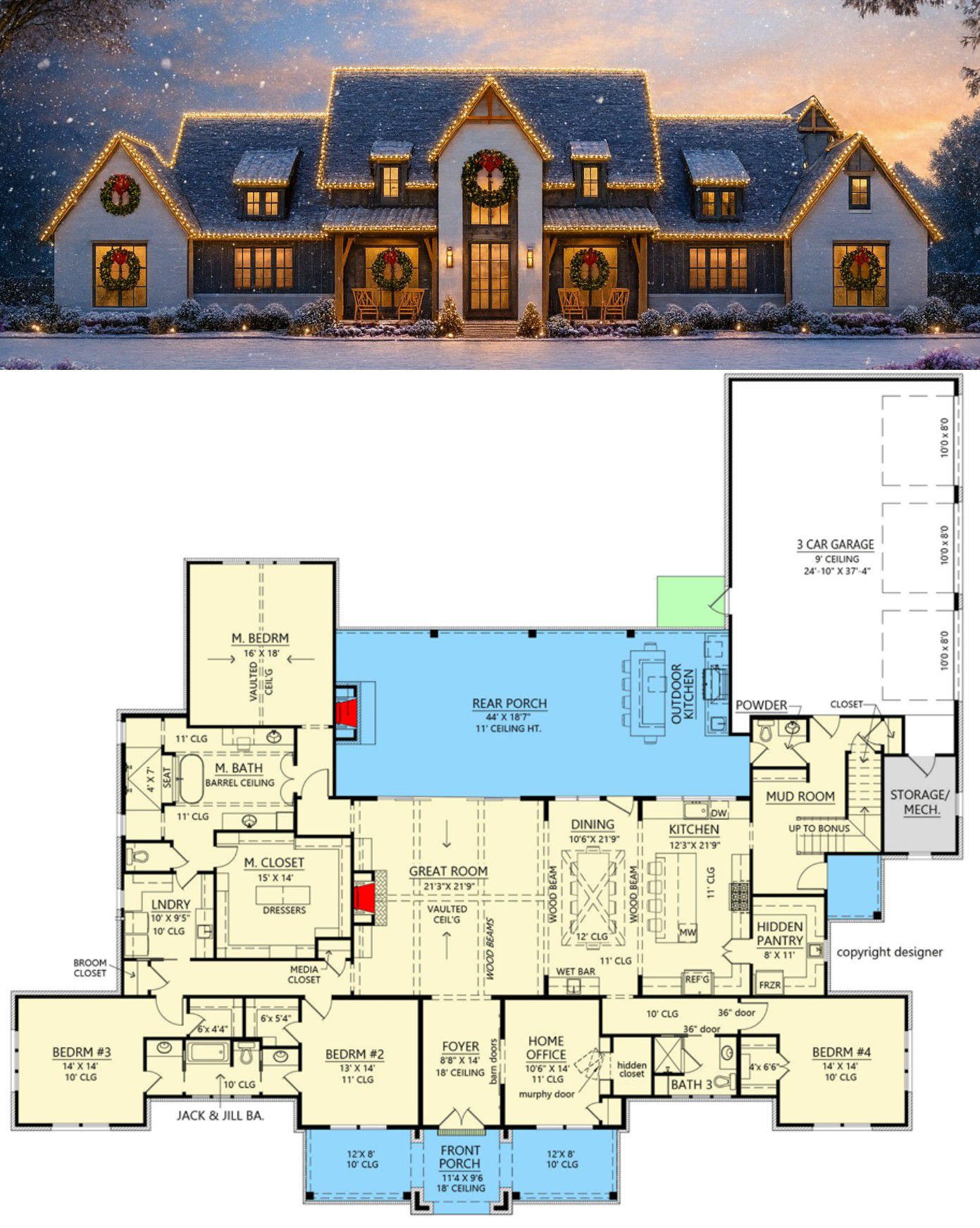 This plan stands out by marrying spaciousness with everyday livability. The large open core and vaulted living areas create a sense of freedom and flow. Outdoor features like the kitchen and fireplace encourage entertainment and connection with nature. Meanwhile, the 4-bedroom layout and flexible floorplan ensure the home adapts to evolving family needs. It’s modern, welcoming, and built for living well — both now and for years to come. “`9