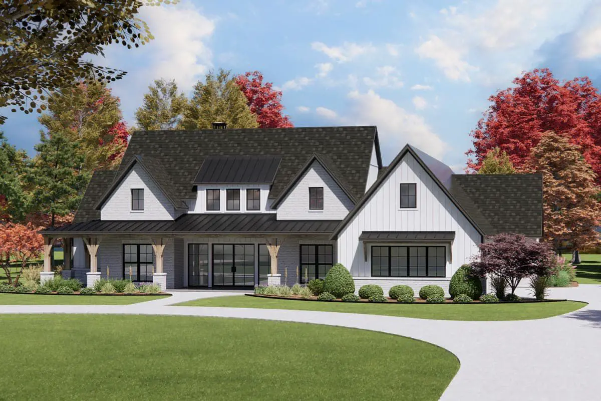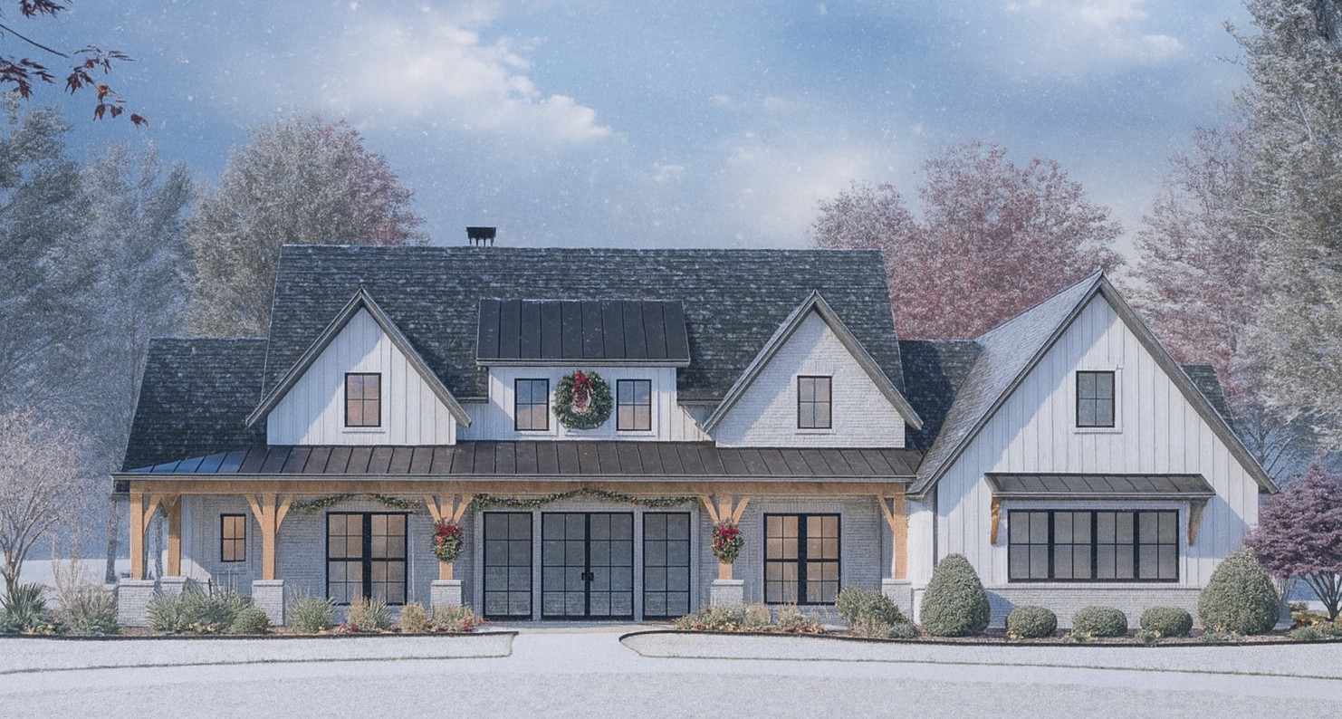 This modern-farmhouse plan provides ~ 3,254 sq ft of living space, with 4 bedrooms, 4 full baths + 1 half bath, a 3-car garage, a home office, and direct laundry access from the master suite — a blend of comfort, convenience, and flexibility.