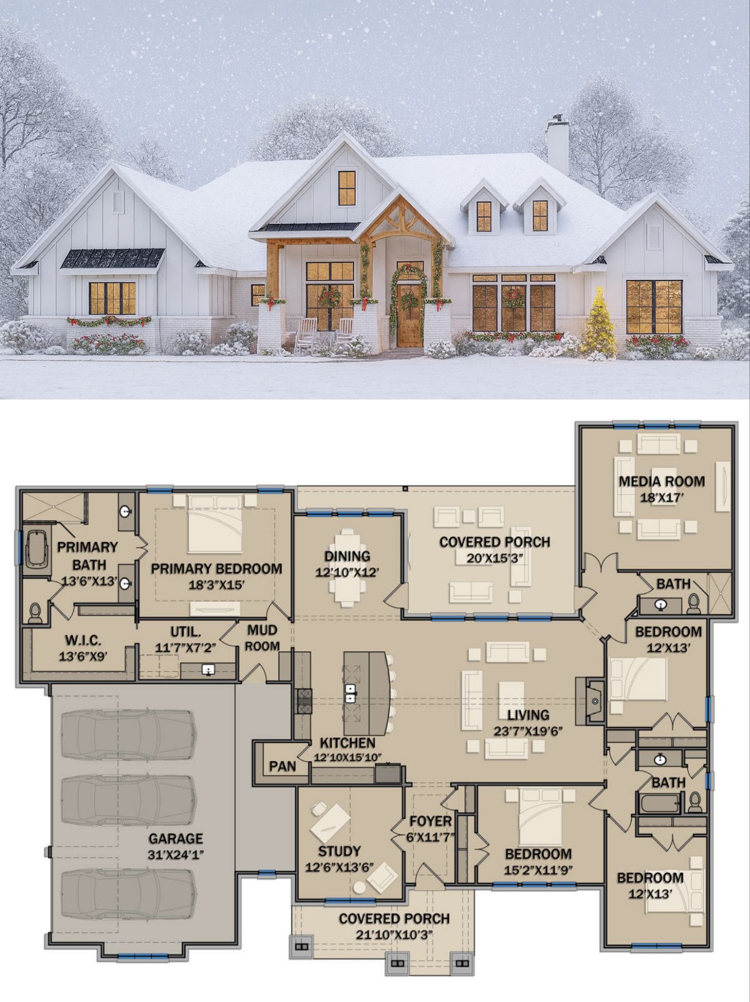 The open living areas encourage shared time, while the optional extra bedroom gives future adaptability. The 3-car garage and mudroom add everyday convenience and storage, making it a balanced and versatile home layout.