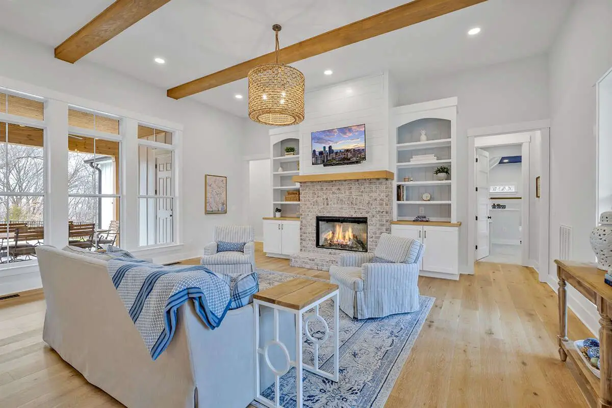 The great room centers on a gas-log fireplace with built-in shelving and sliding French doors leading to the rear porch — making the transition from indoor to outdoor space smooth and inviting.