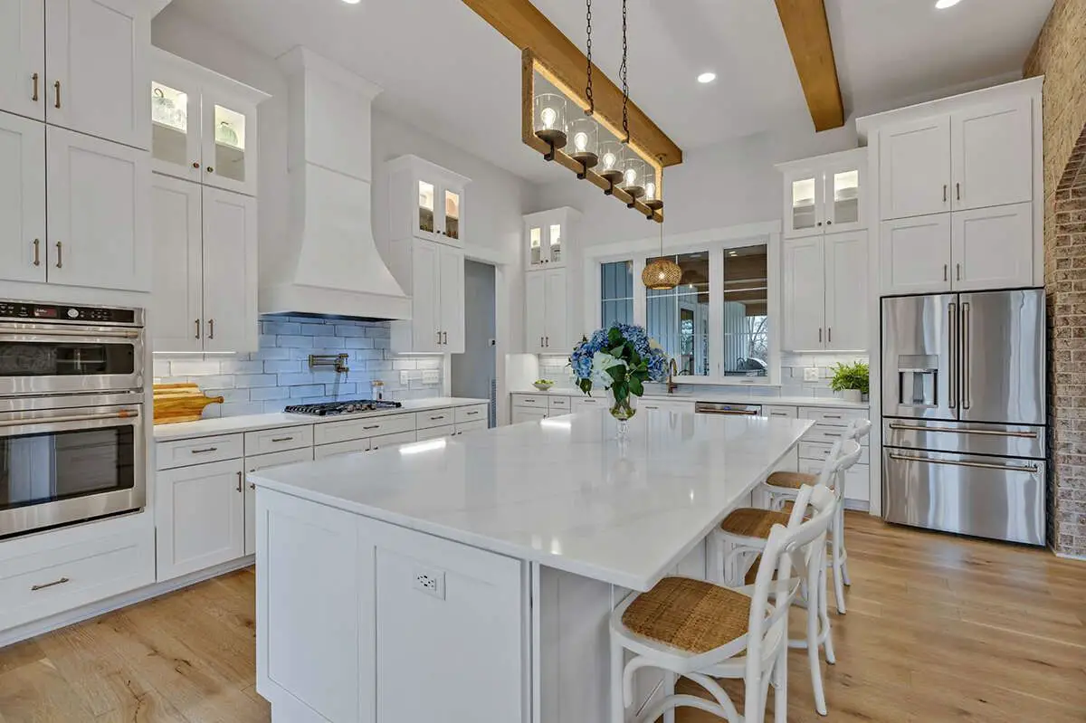 The kitchen features a large prep island with seating, a dry bar, and a walk-in pantry — practical for everyday cooking and large-meal prep alike. 5