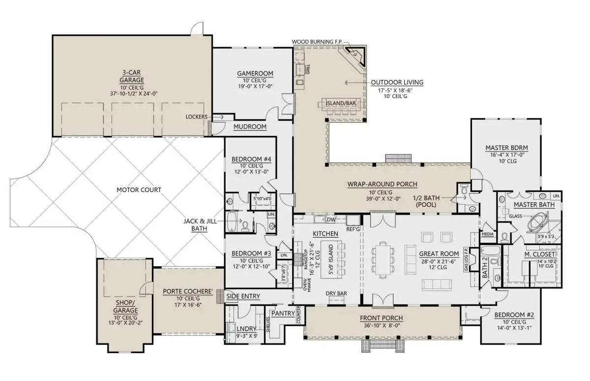 | Porches / Outdoor Living | Front covered porch + wrap-around rear porch with fireplace and grilling/bar area |