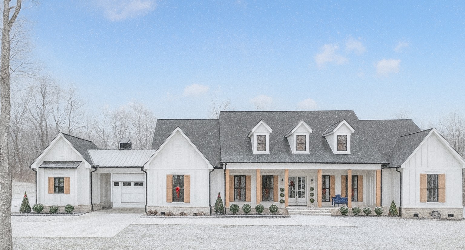The exterior showcases classic modern-farmhouse appeal: board-and-batten siding with a brick perimeter skirt, dormer windows, window panels, and column beams on the covered front porch — giving a balanced mix of rustic charm and clean modern lines.