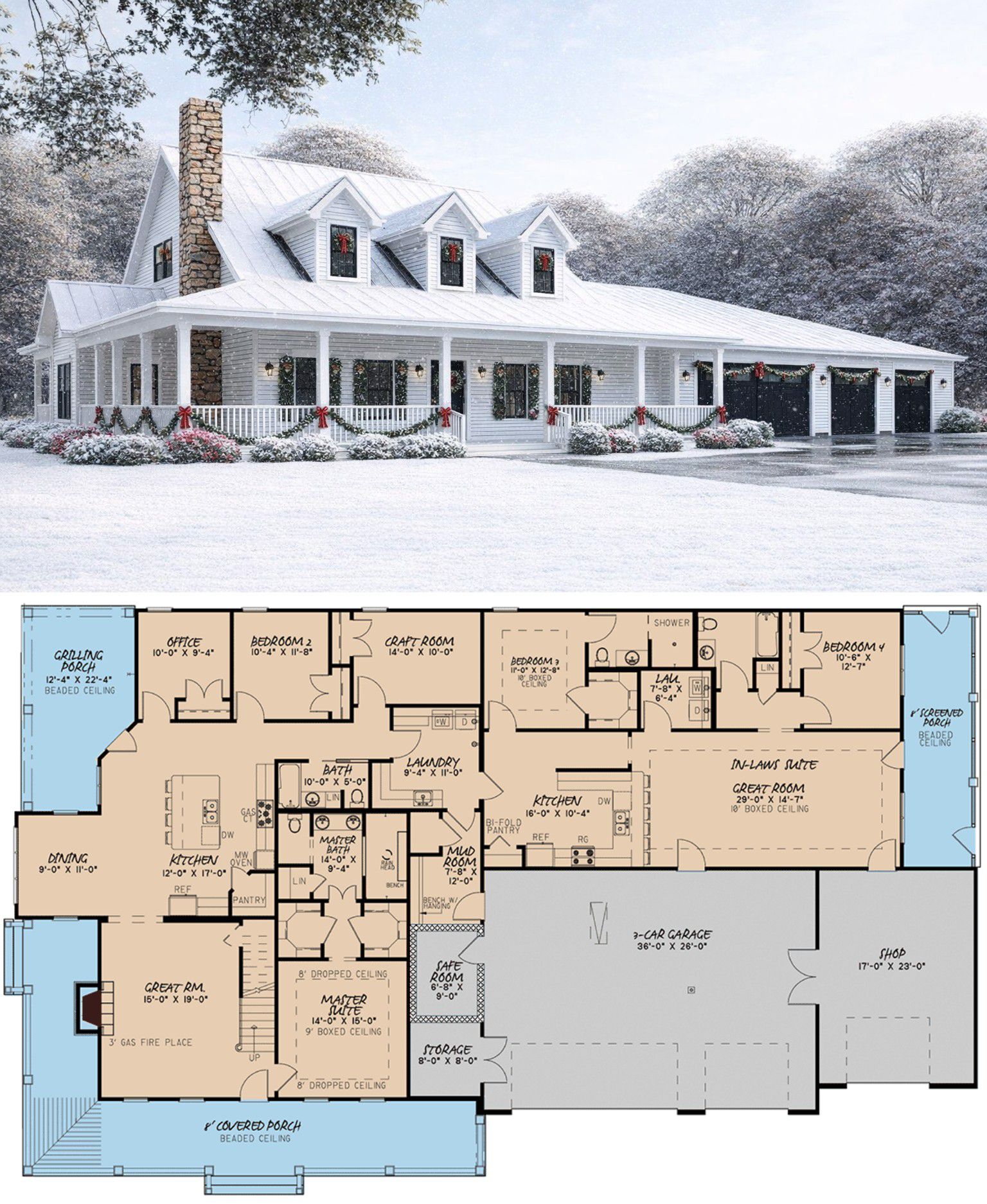 This plan is configured as a **main house + in-law suite under one roof**. The main house offers its own kitchen, living areas, bedrooms and bathrooms. Meanwhile, the in-law apartment provides a **fully independent living space** with its own kitchen, baths, and laundry — giving privacy and autonomy while keeping family close.