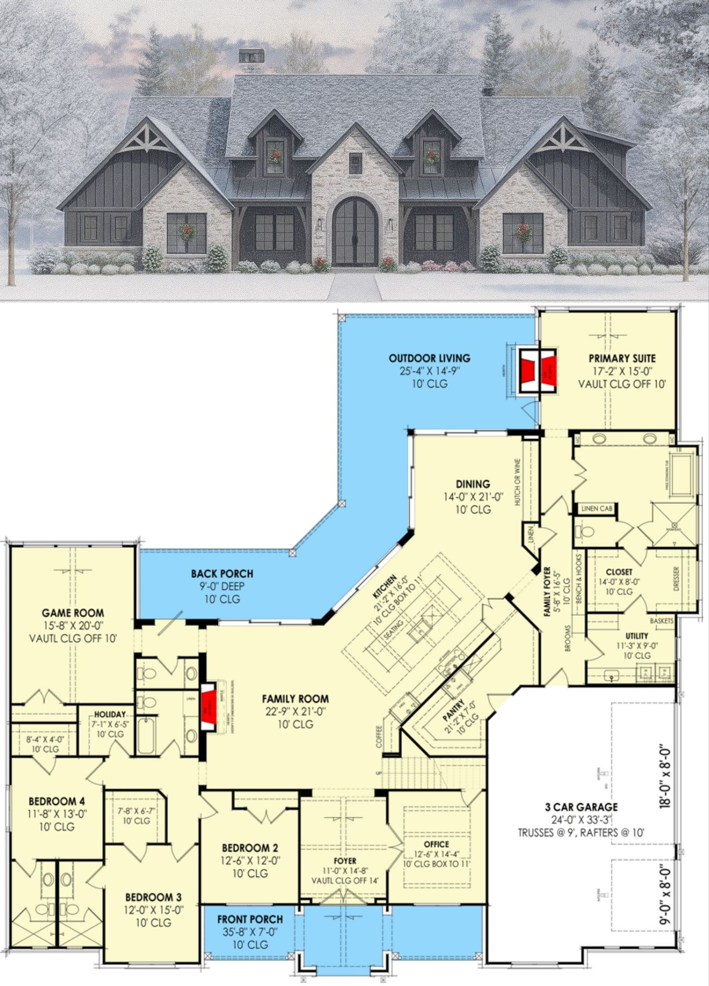 – The left wing clusters the **three other bedrooms** together, along with a vaulted **game/rec room**, creating a kids/guest zone that’s separate from the master wing — helpful for sound separation and privacy. 6